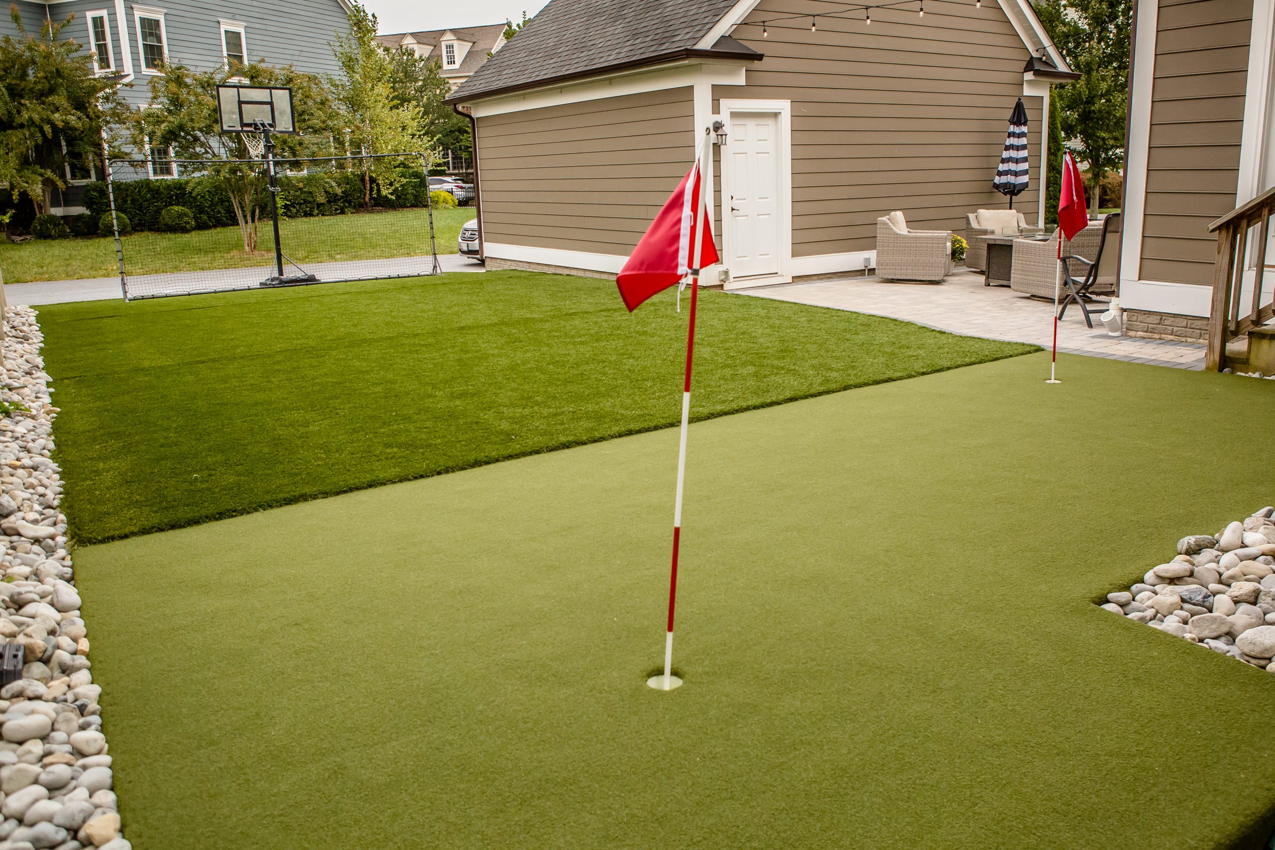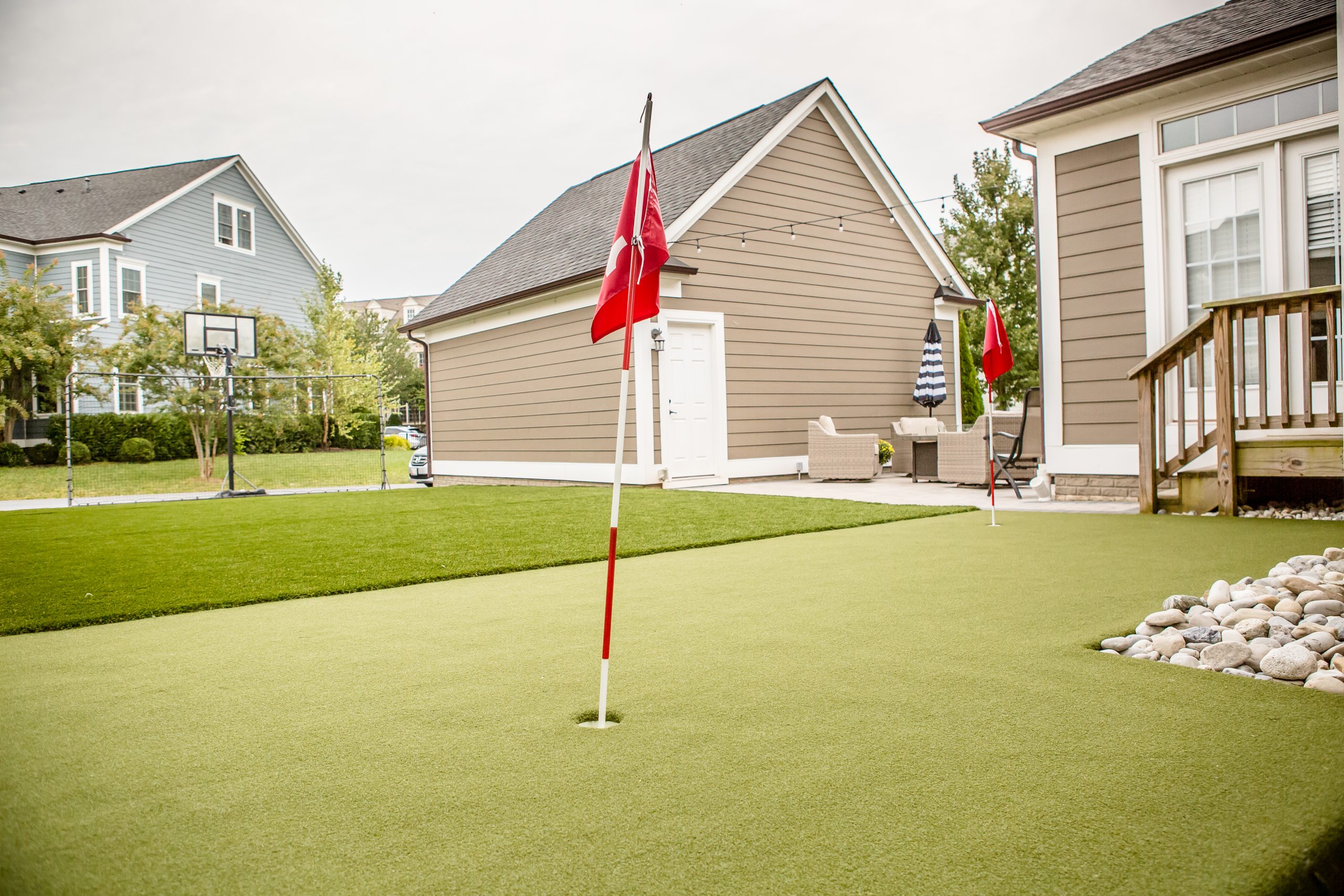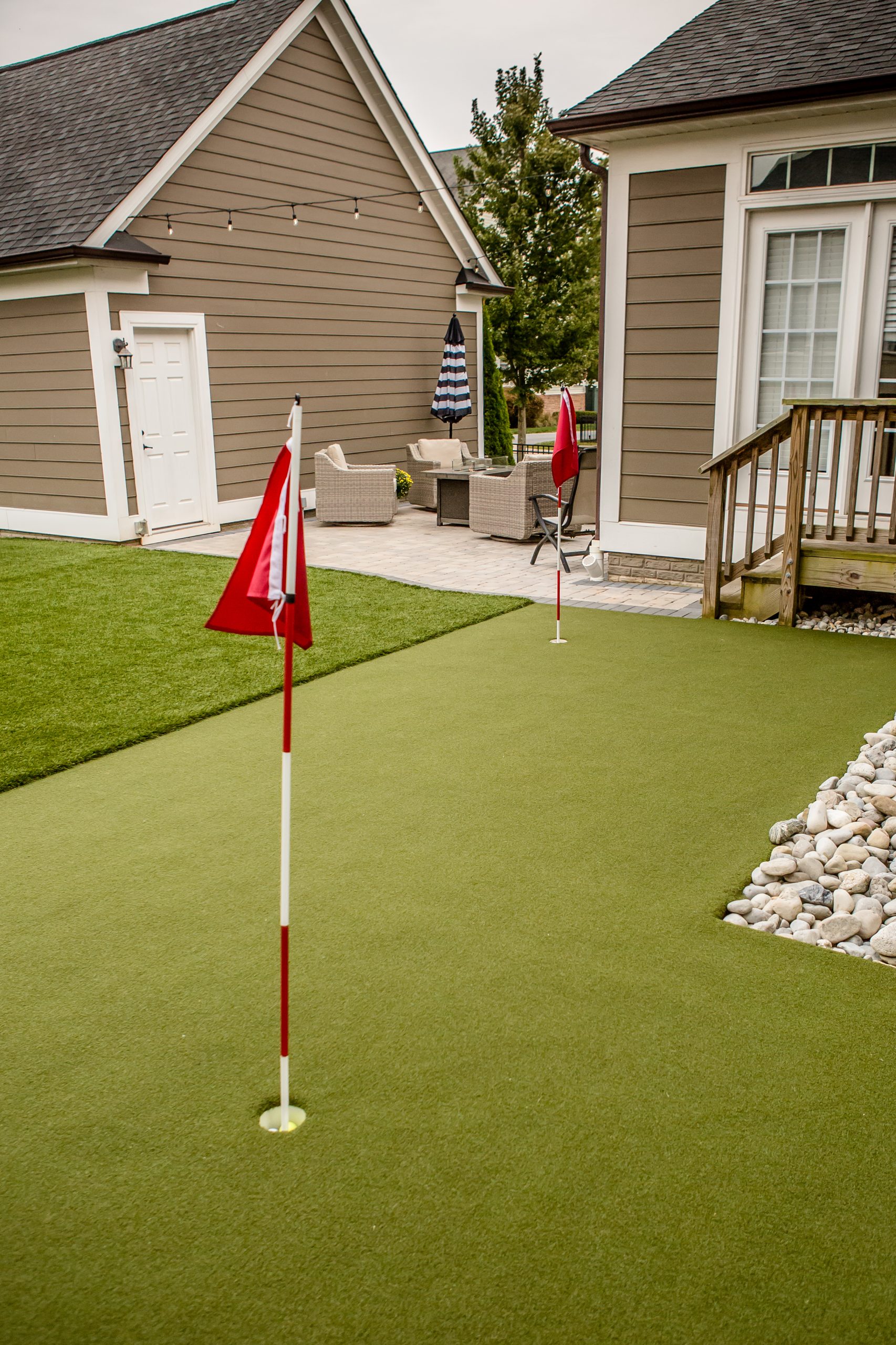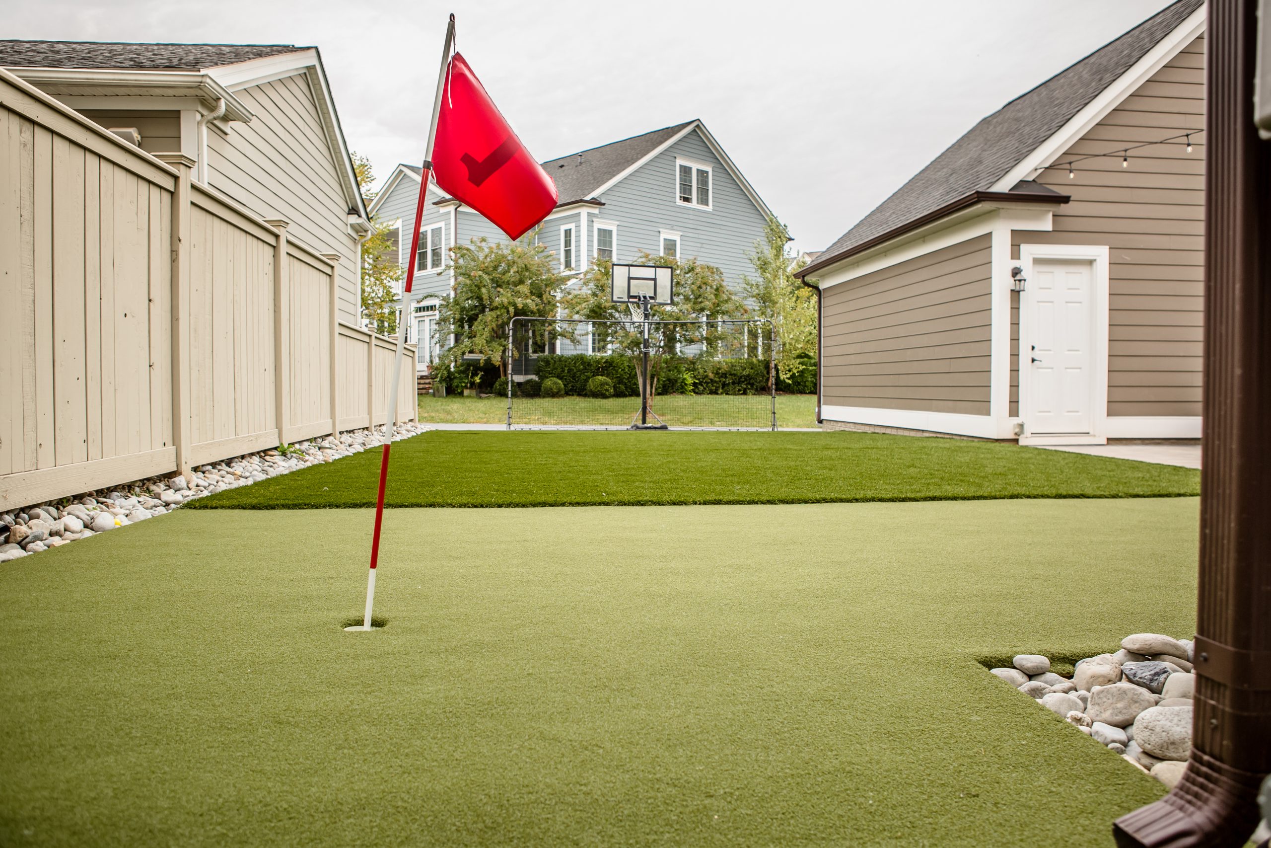 Hometown Landscape designed and installed a custom backyard putting green with sports turf, providing a realistic practice environment for golfers. The turf delivers a smooth, consistent putting surface that allows for daily practice and skill development at home. Professional installation and careful layout ensure proper drainage, durability, and long-term performance. Browse the gallery to see how this putting green brings the feel of the course to the backyard while maintaining a clean, polished look year-round.
