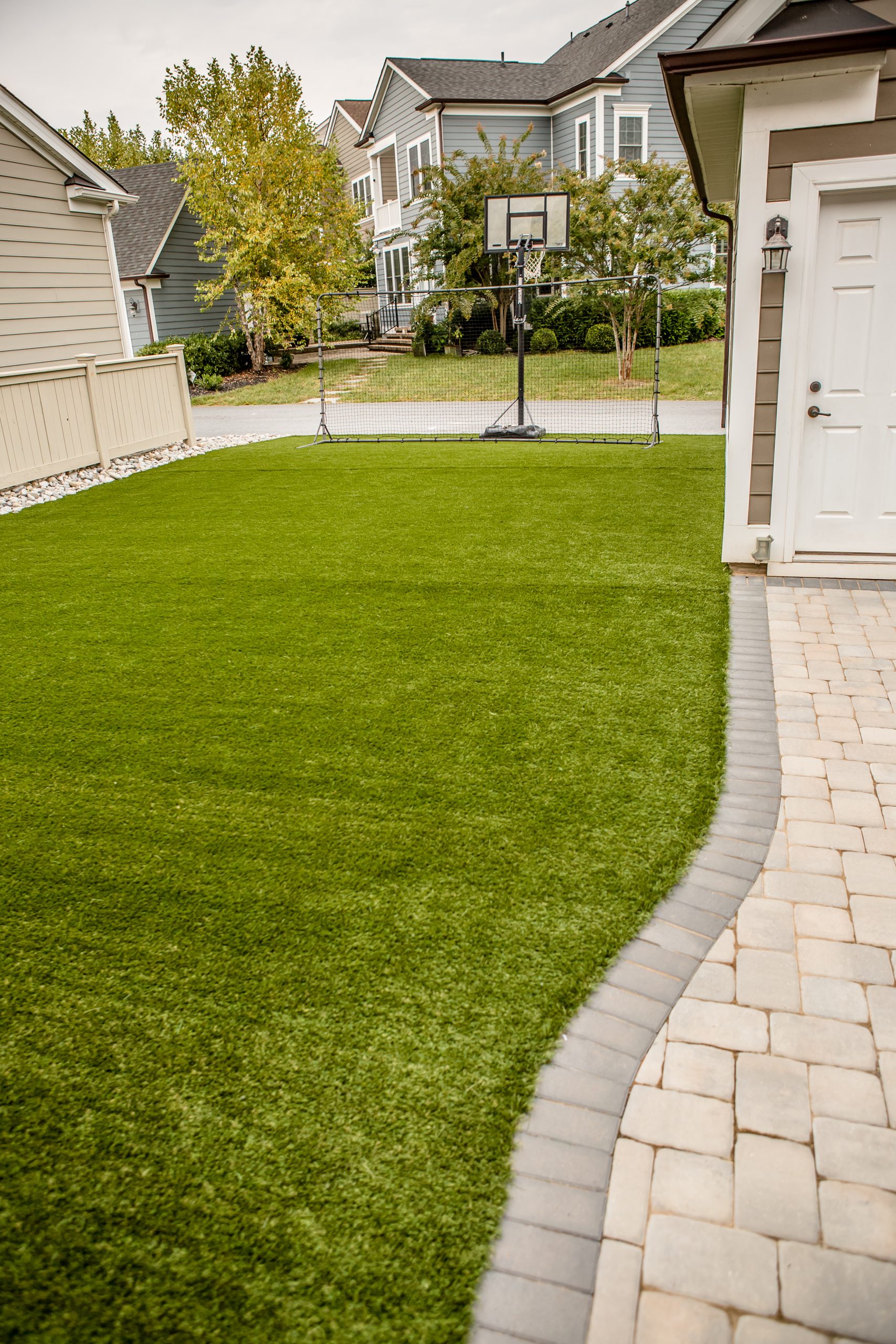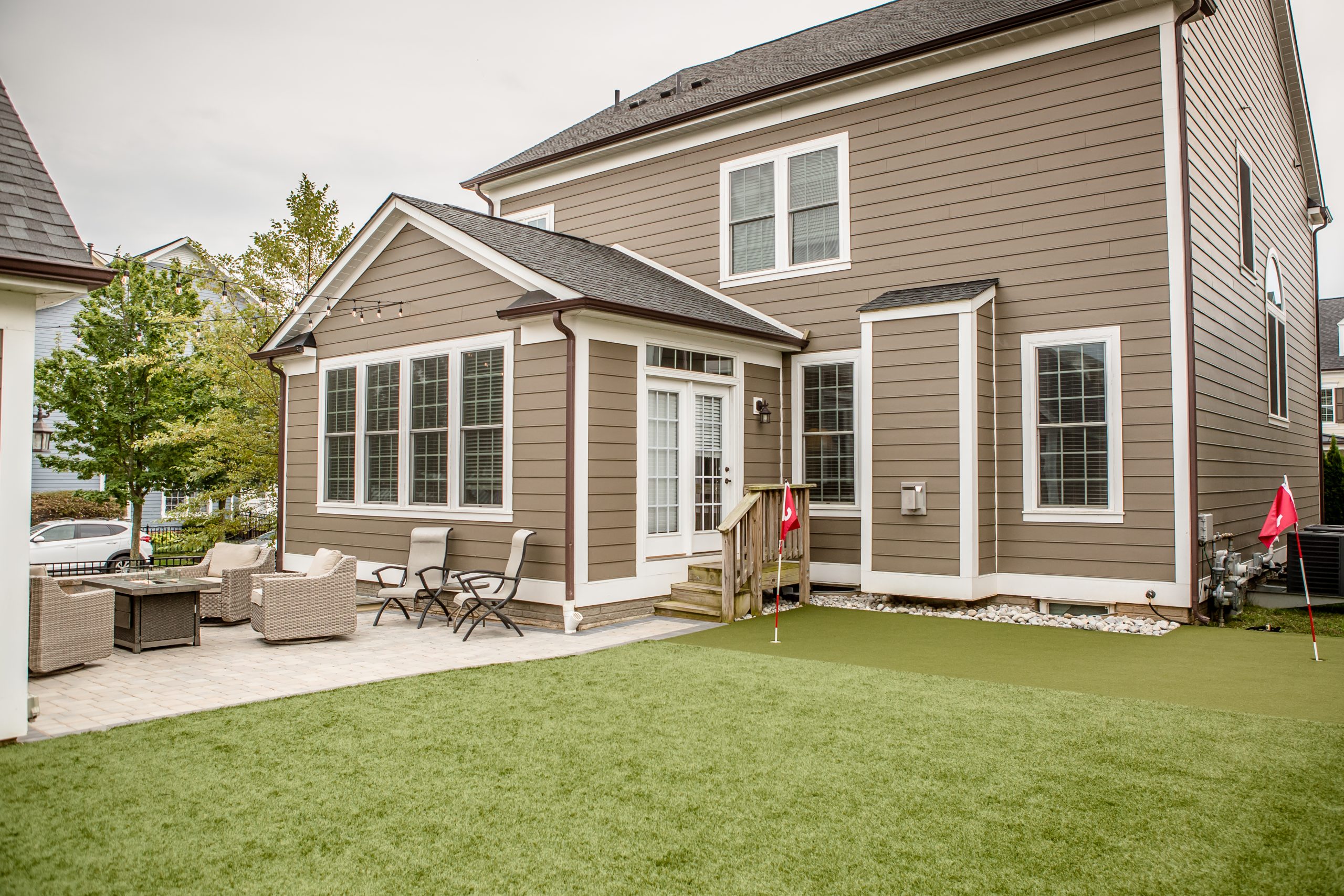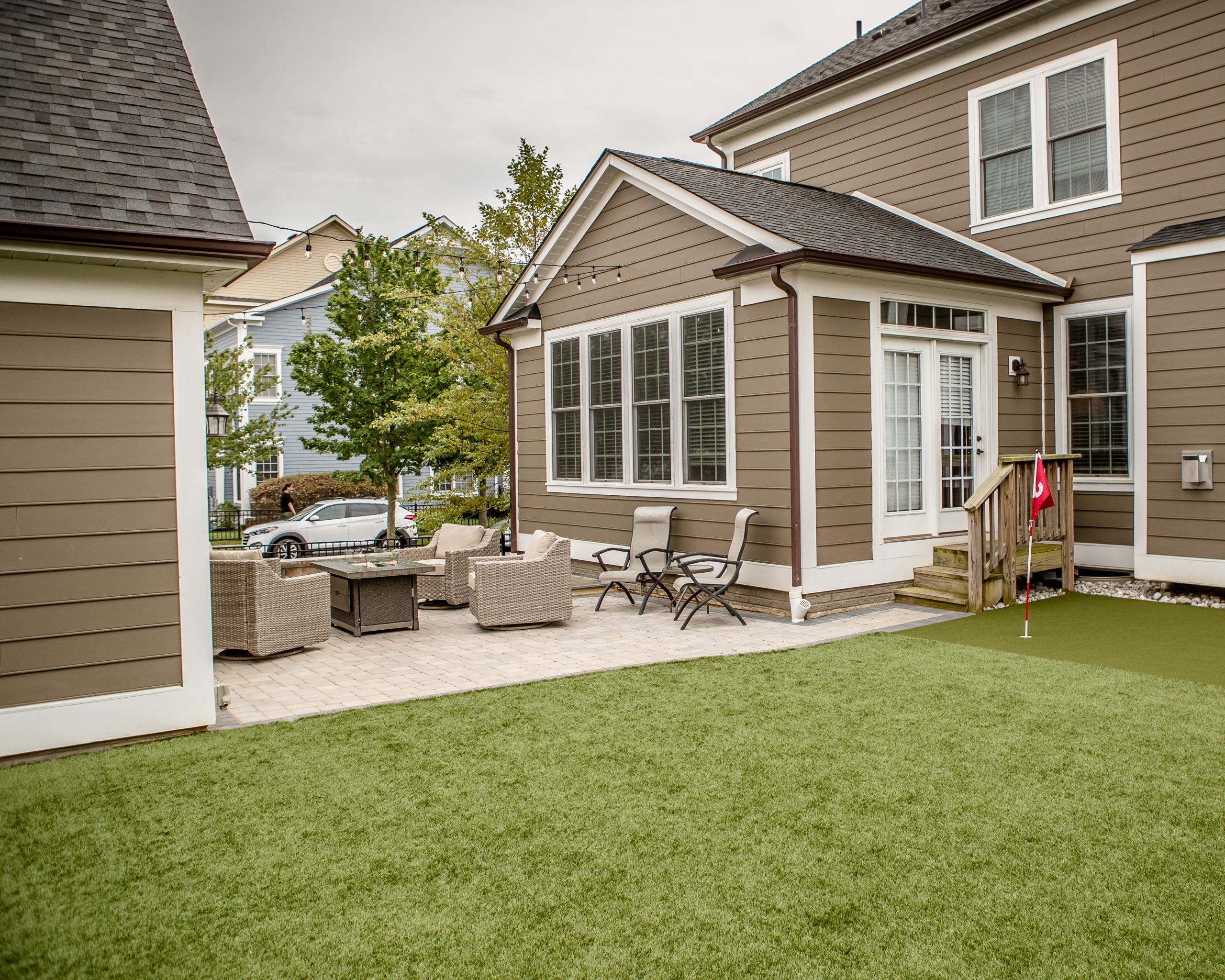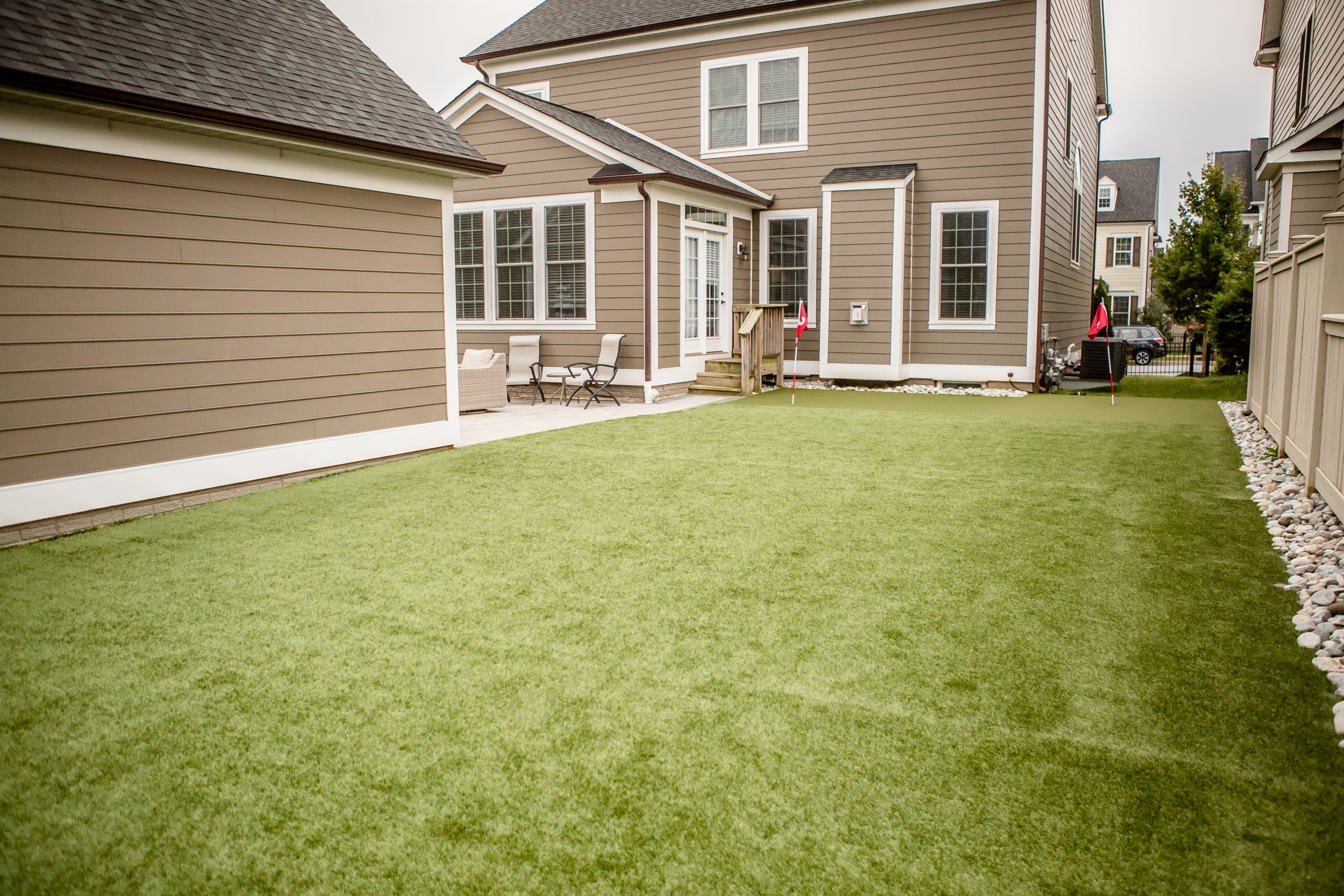 Hometown Landscape designed and installed a custom backyard putting green with sports turf, providing a realistic practice environment for golfers. The turf delivers a smooth, consistent putting surface that allows for daily practice and skill development at home. Professional installation and careful layout ensure proper drainage, durability, and long-term performance. Browse the gallery to see how this putting green brings the feel of the course to the backyard while maintaining a clean, polished look year-round.
