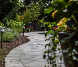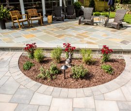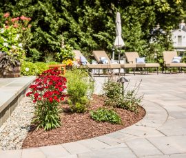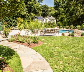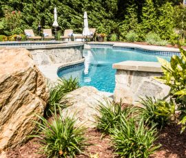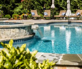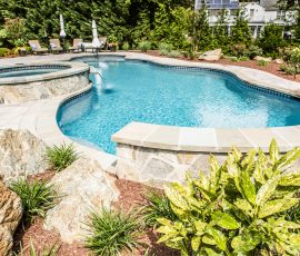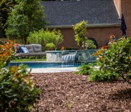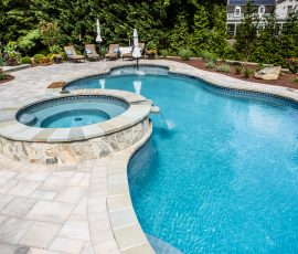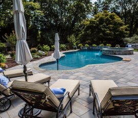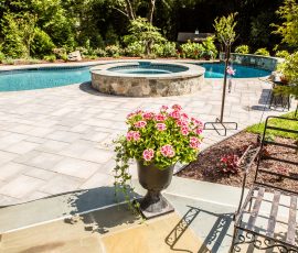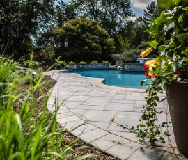 Hometown Landscape completed this backyard project with a custom pool, water feature, coordinated patio, plantings, and mulch. Our team built the pool deck with Unilock Beacon Hill pavers for durability and style, while the flagstone patio and step transitions use Pennsylvania Flagstone, providing a natural, elegant surface for relaxing and entertaining. Thoughtfully placed plantings add structure and color throughout the landscape. Browse the gallery to see how pool design, hardscaping, and landscaping come together in one well-balanced backyard.