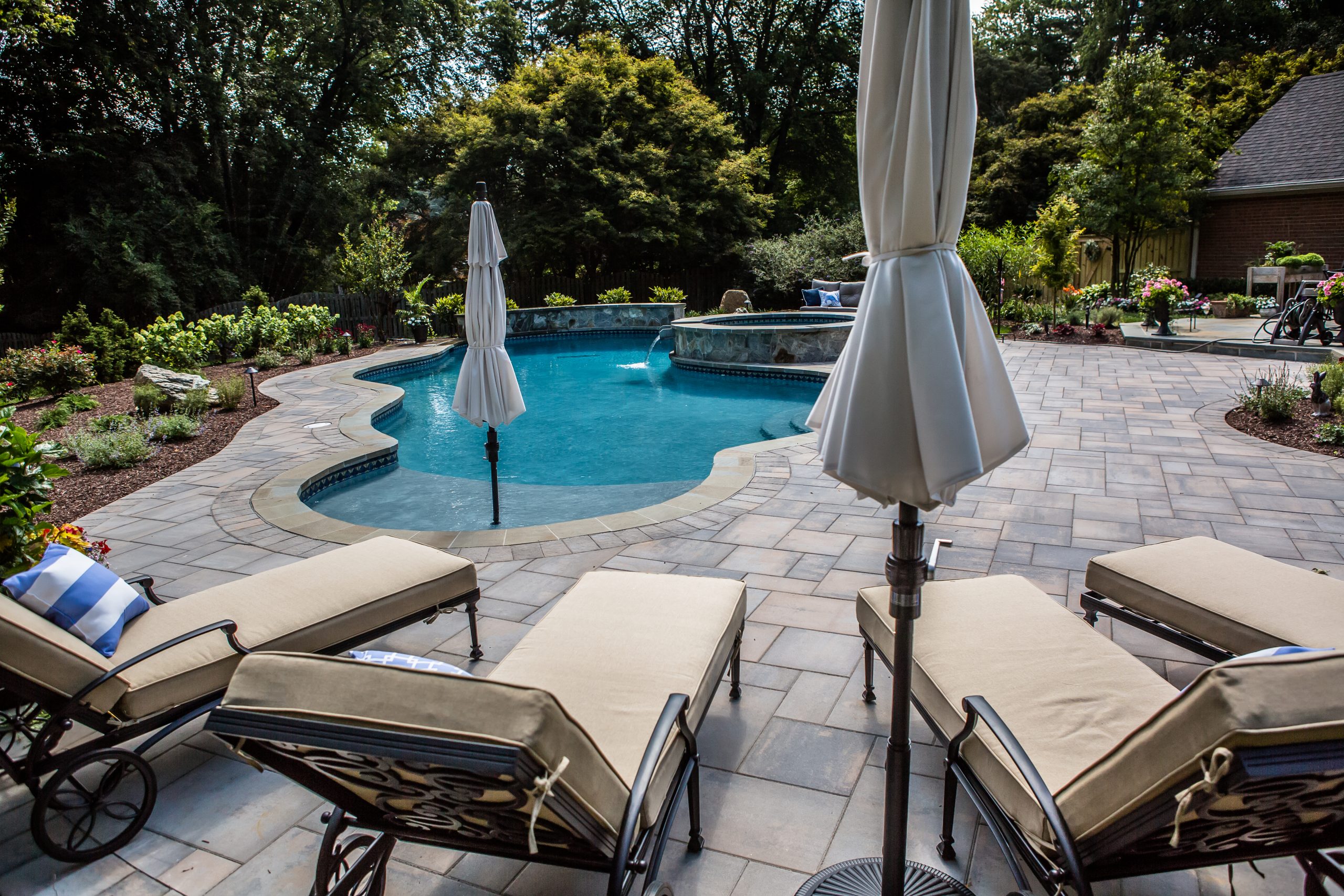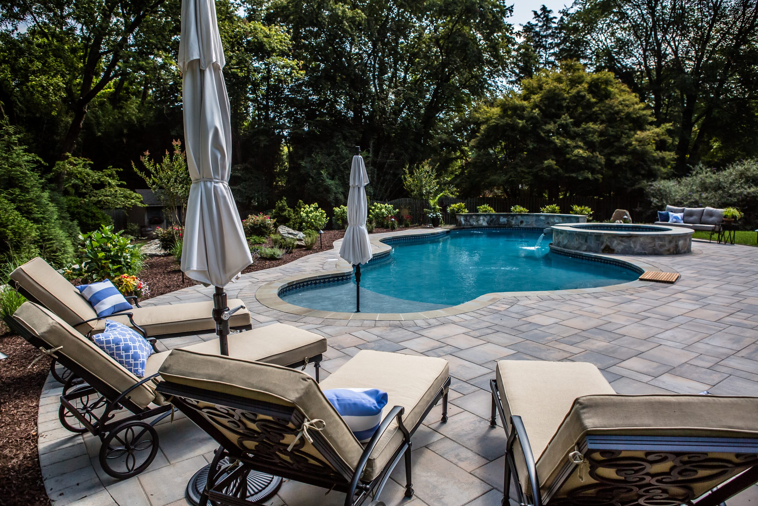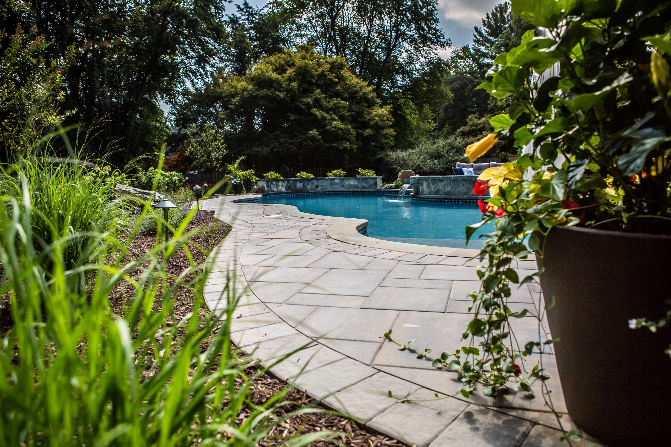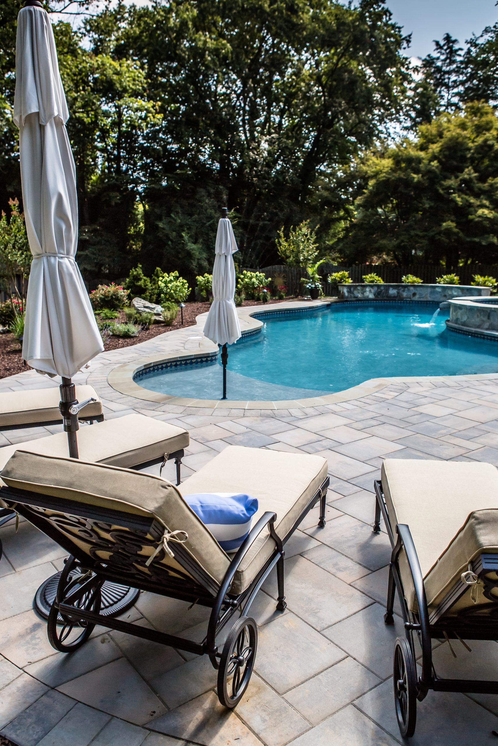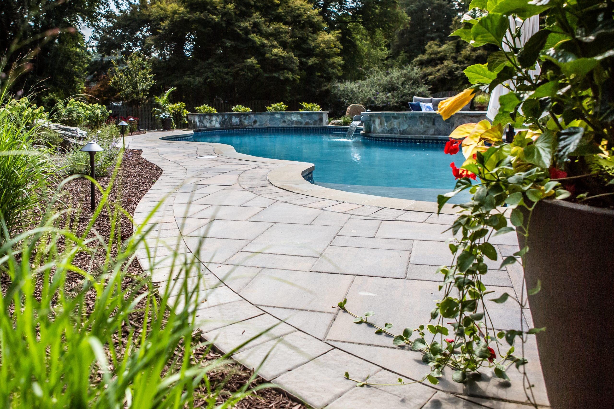 Hometown Landscape completed this backyard project with a custom pool, water feature, coordinated patio, plantings, and mulch. Our team built the pool deck with Unilock Beacon Hill pavers for durability and style, while the flagstone patio and step transitions use Pennsylvania Flagstone, providing a natural, elegant surface for relaxing and entertaining. Thoughtfully placed plantings add structure and color throughout the landscape. Browse the gallery to see how pool design, hardscaping, and landscaping come together in one well-balanced backyard.