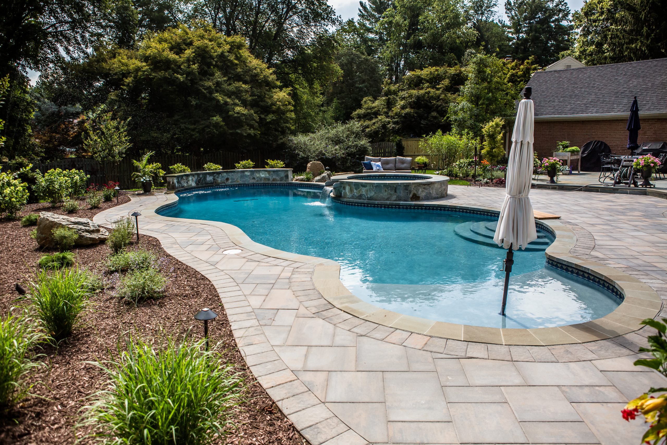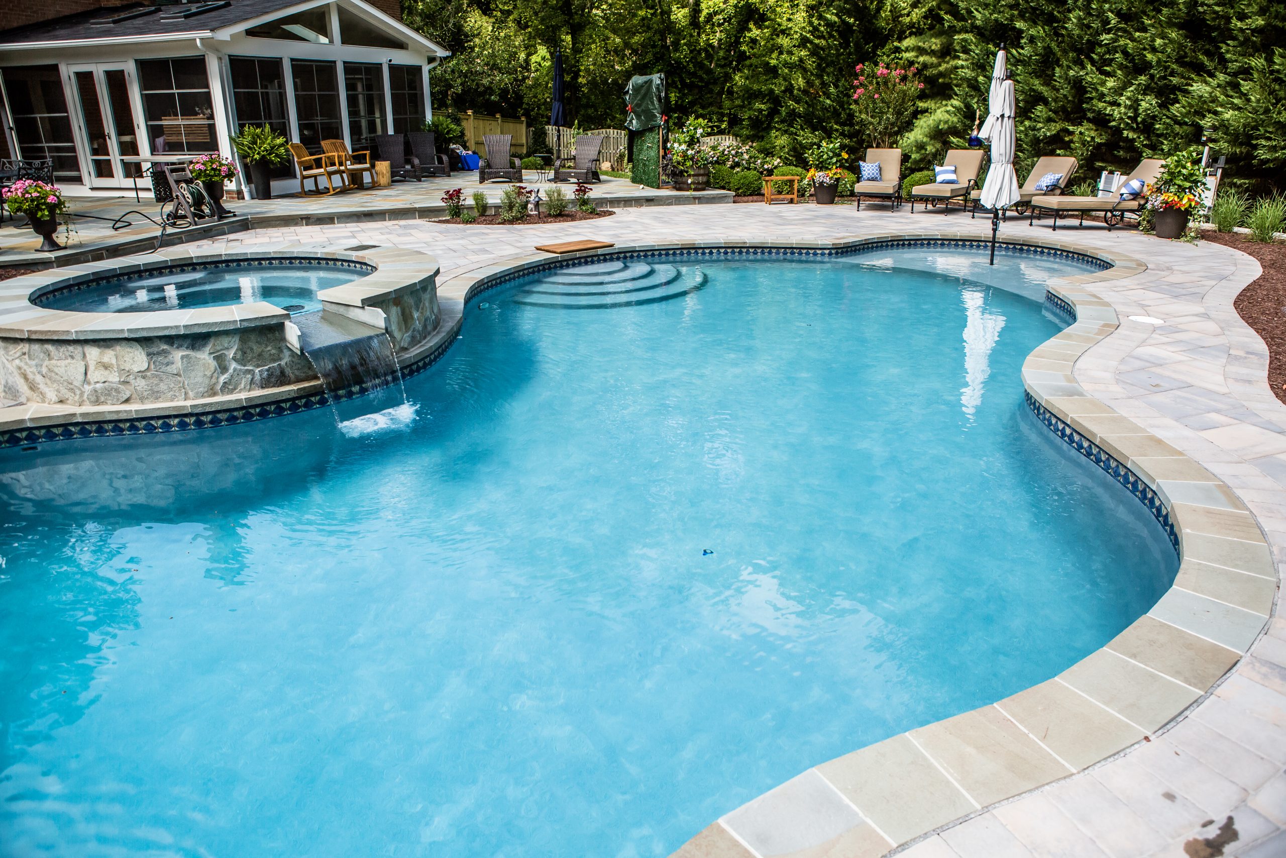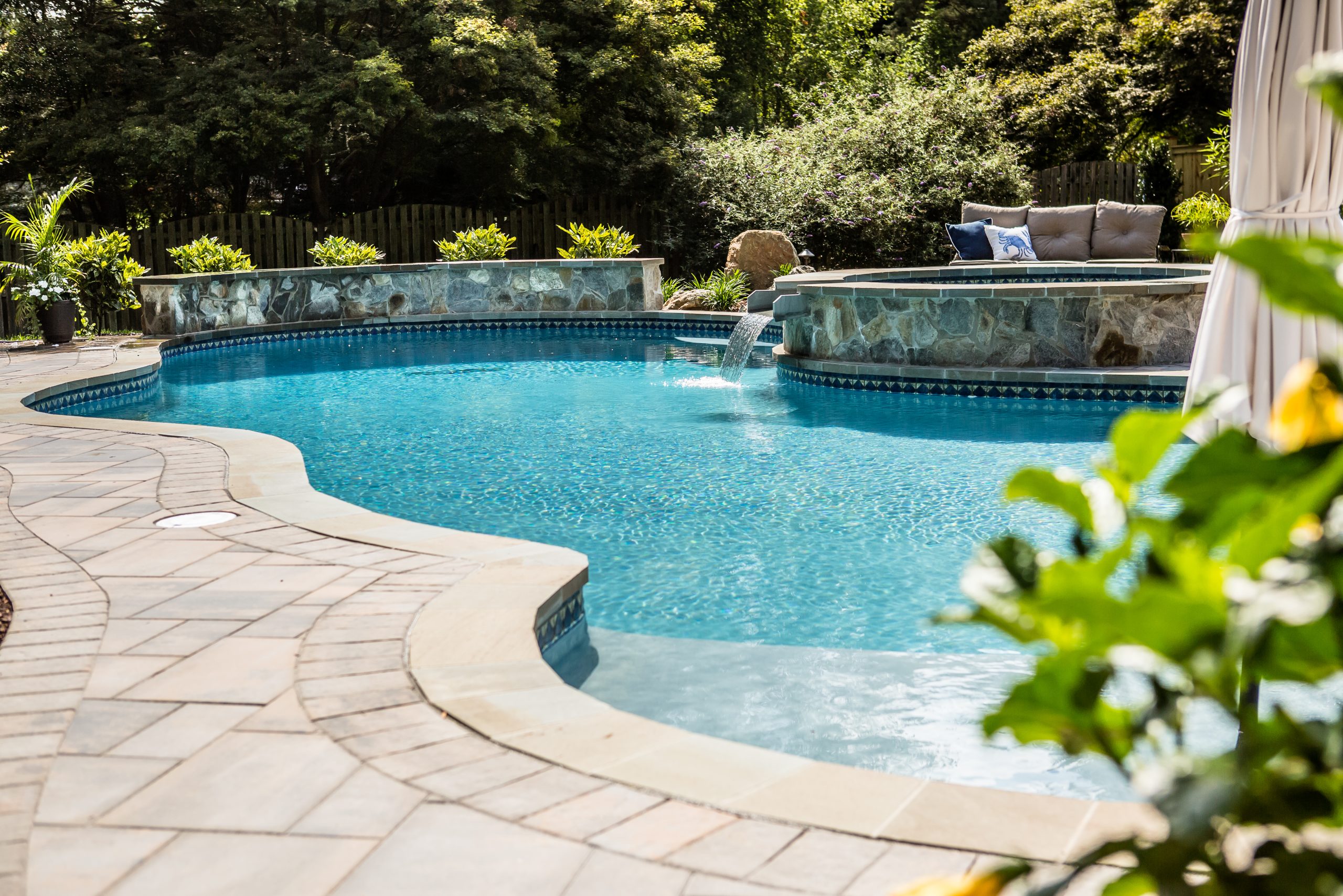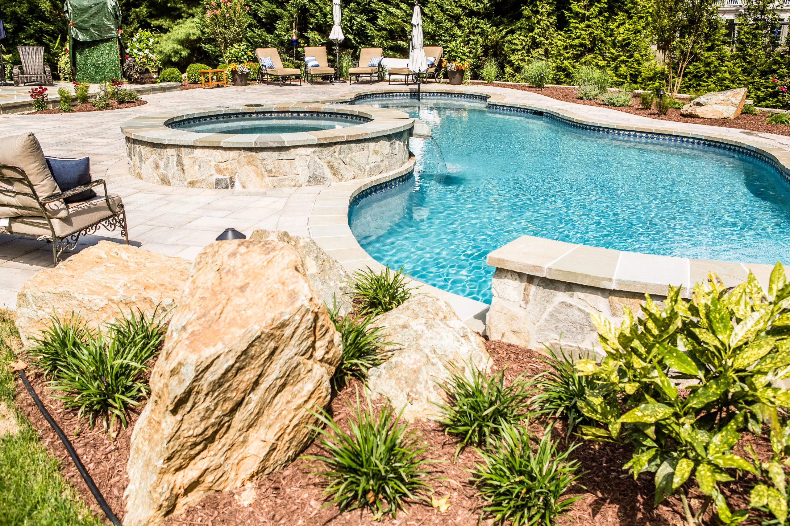 Hometown Landscape completed this backyard project with a custom pool, water feature, coordinated patio, plantings, and mulch. Our team built the pool deck with Unilock Beacon Hill pavers for durability and style, while the flagstone patio and step transitions use Pennsylvania Flagstone, providing a natural, elegant surface for relaxing and entertaining. Thoughtfully placed plantings add structure and color throughout the landscape. Browse the gallery to see how pool design, hardscaping, and landscaping come together in one well-balanced backyard.