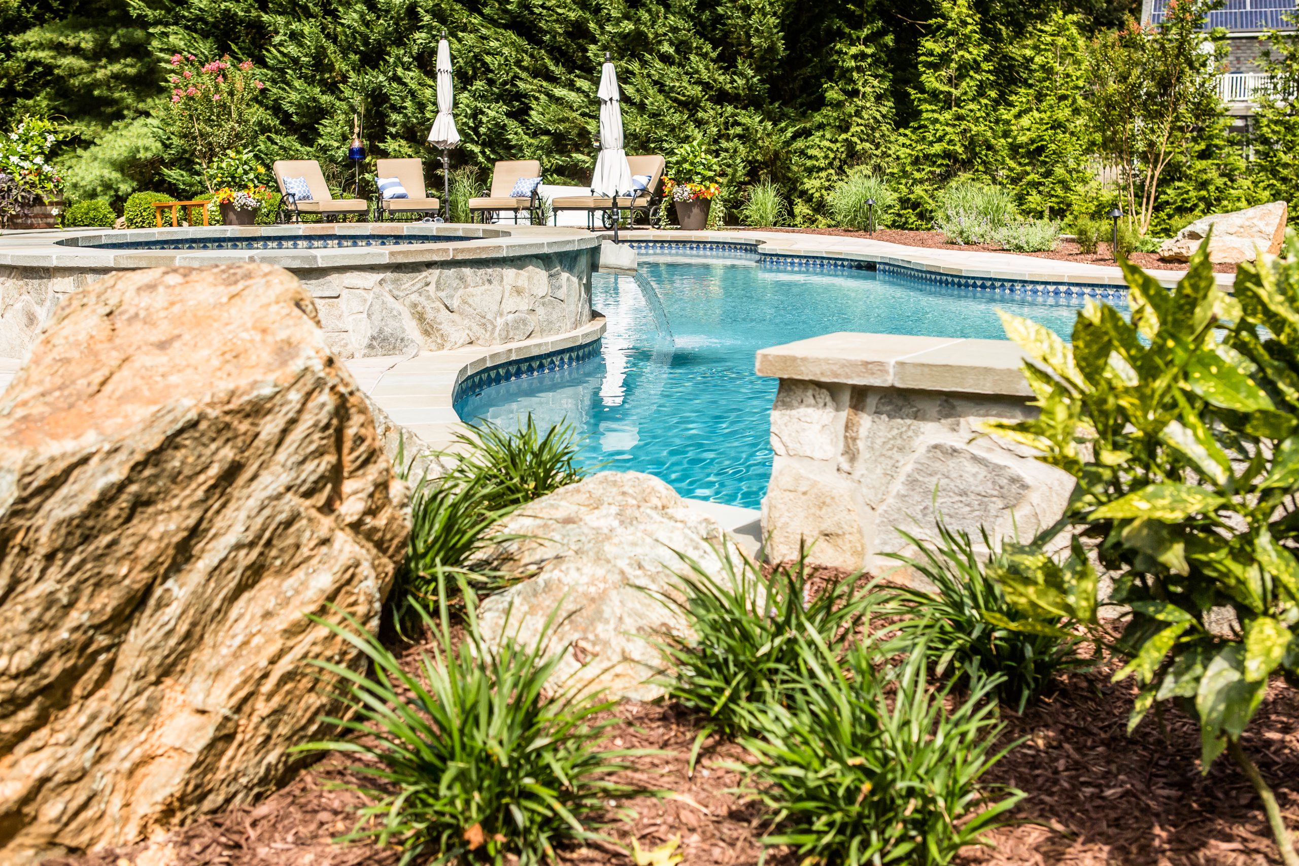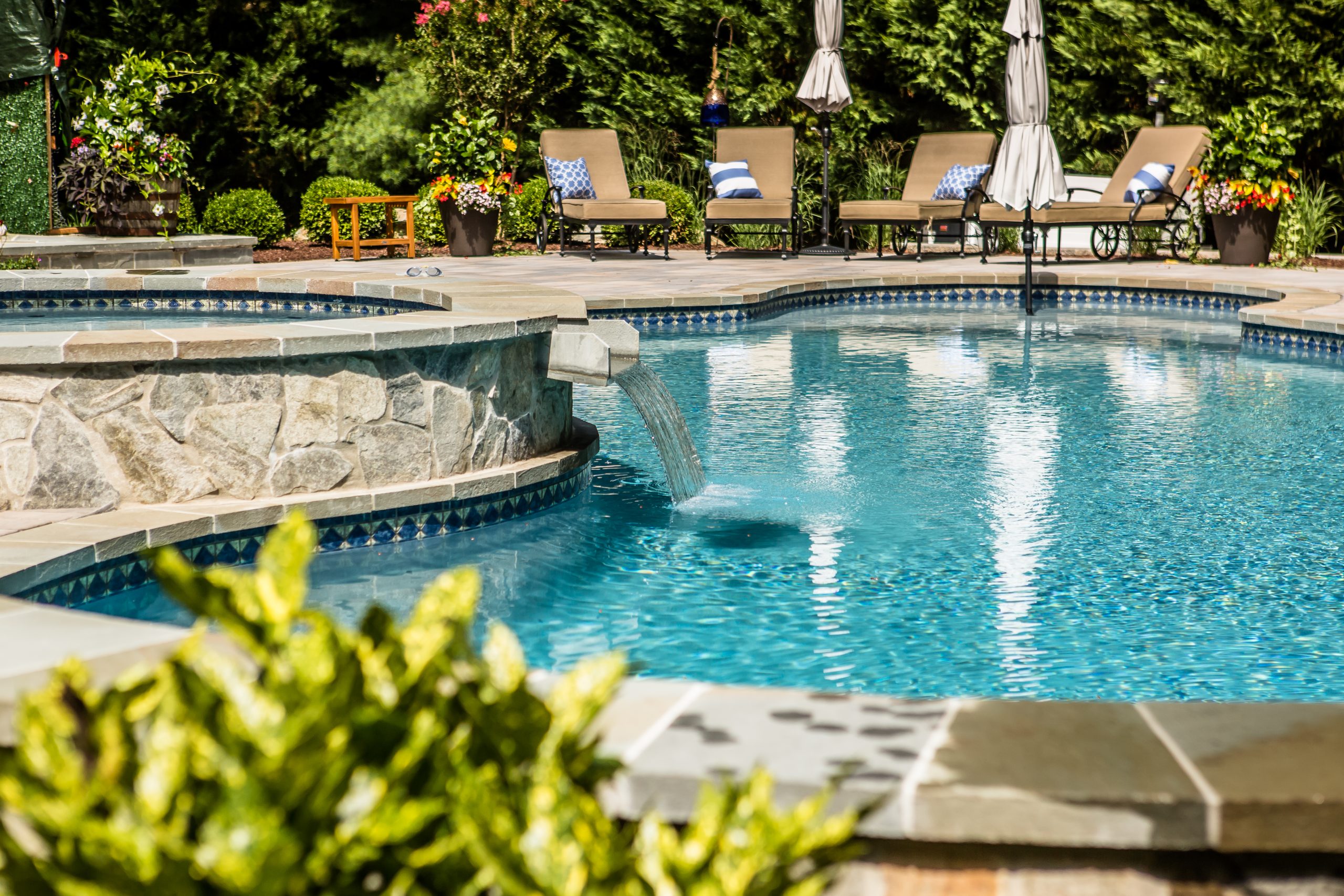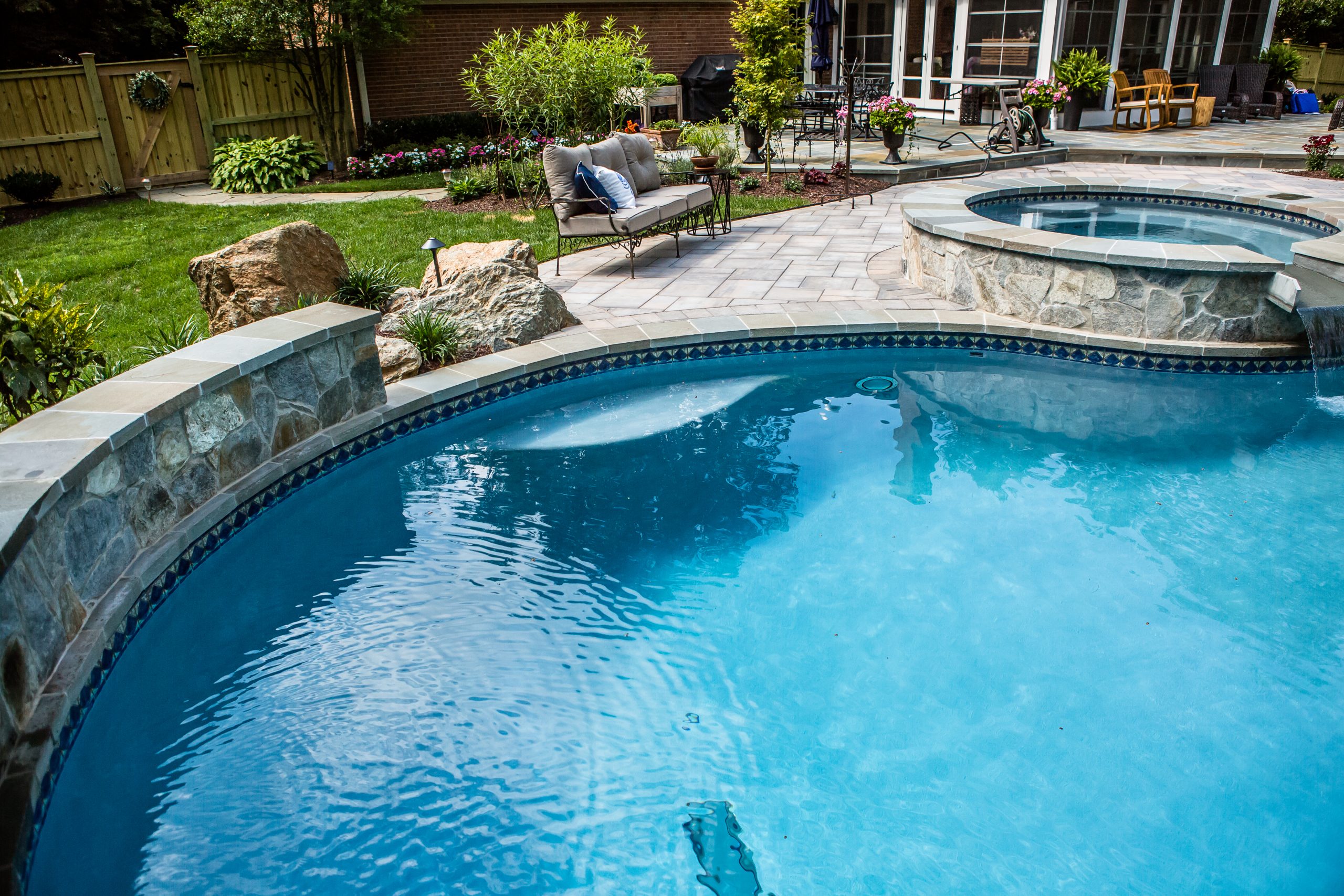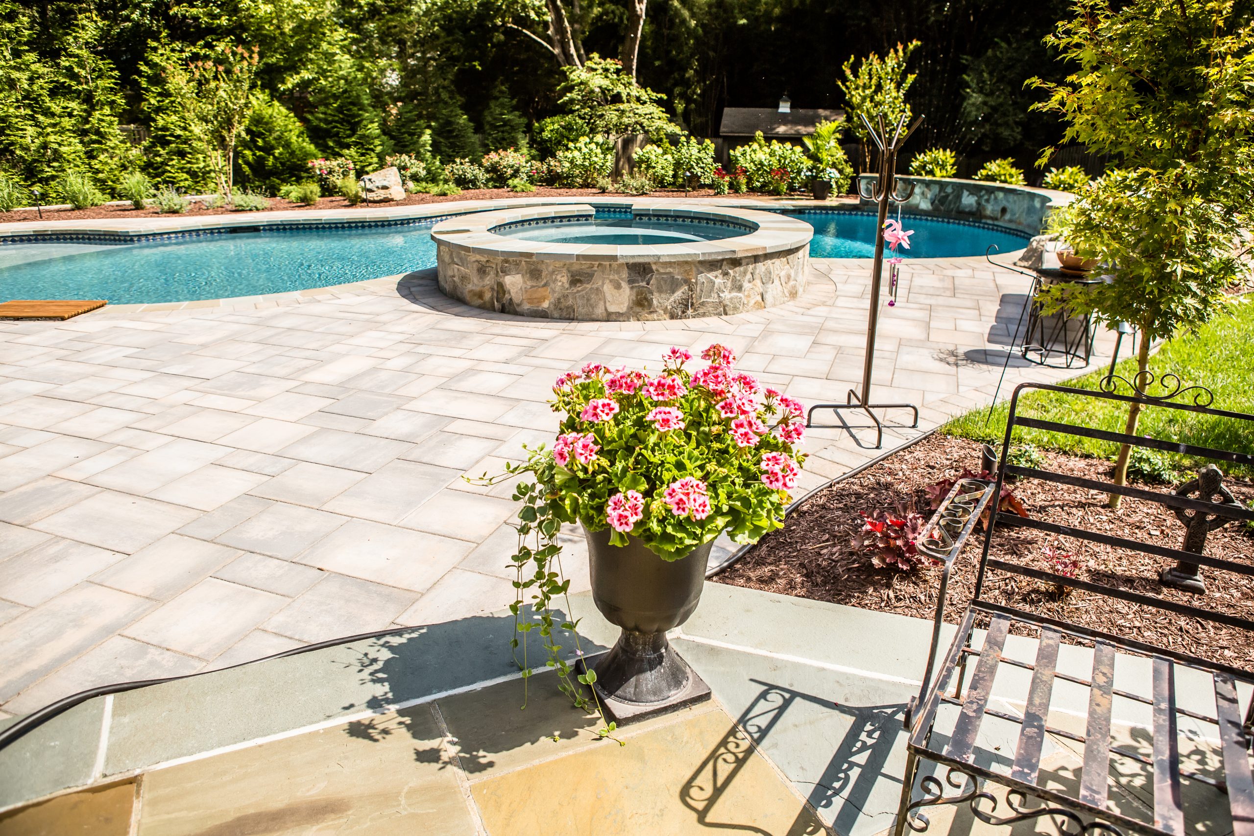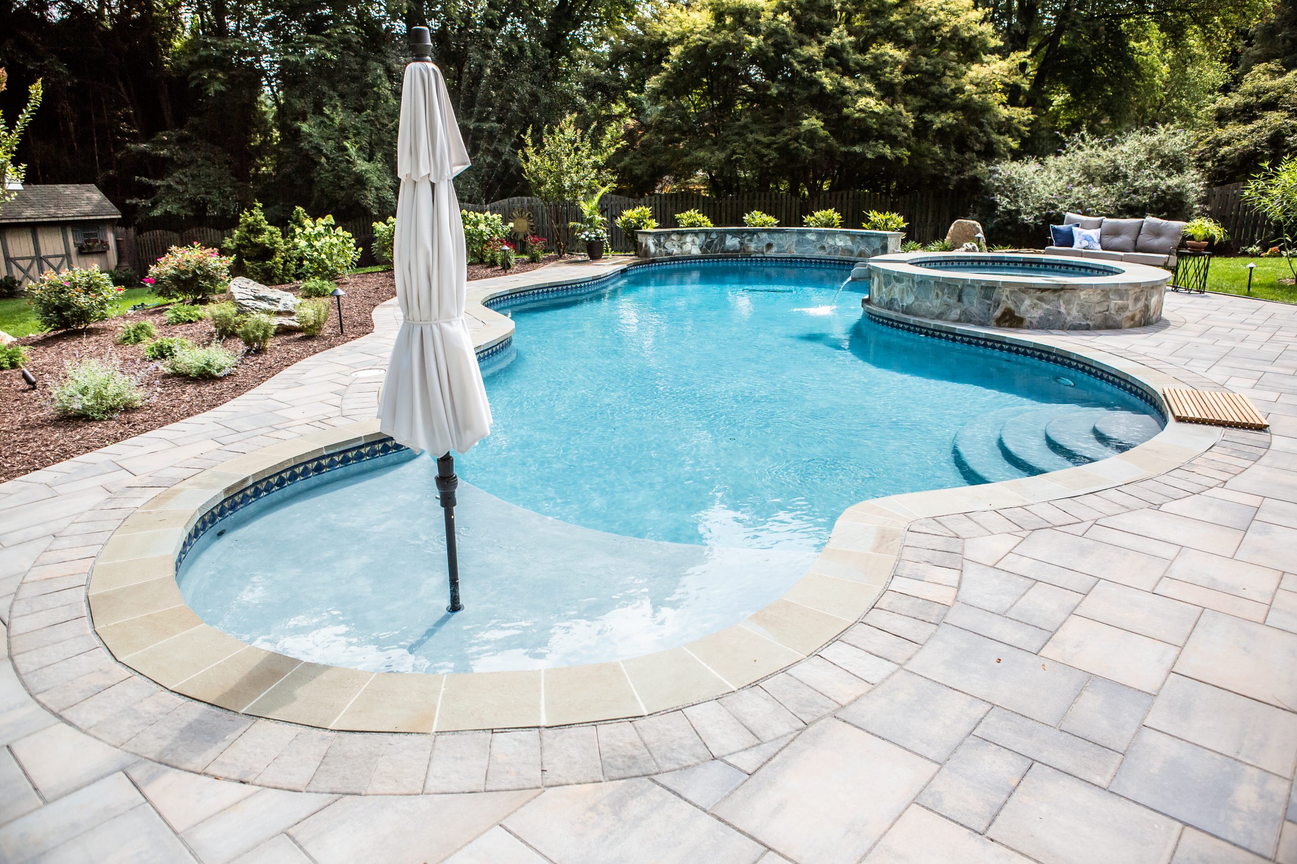 Hometown Landscape completed this backyard project with a custom pool, water feature, coordinated patio, plantings, and mulch. Our team built the pool deck with Unilock Beacon Hill pavers for durability and style, while the flagstone patio and step transitions use Pennsylvania Flagstone, providing a natural, elegant surface for relaxing and entertaining. Thoughtfully placed plantings add structure and color throughout the landscape. Browse the gallery to see how pool design, hardscaping, and landscaping come together in one well-balanced backyard.
