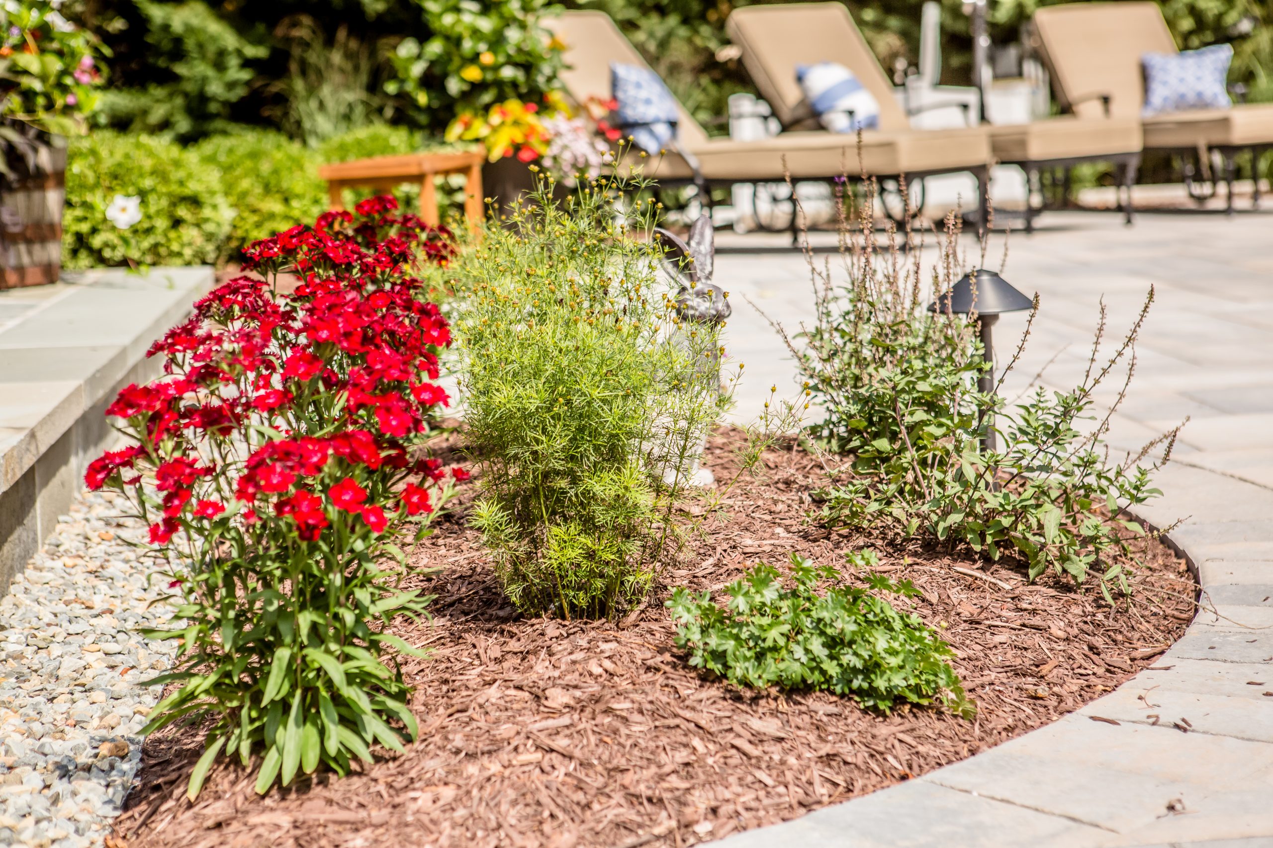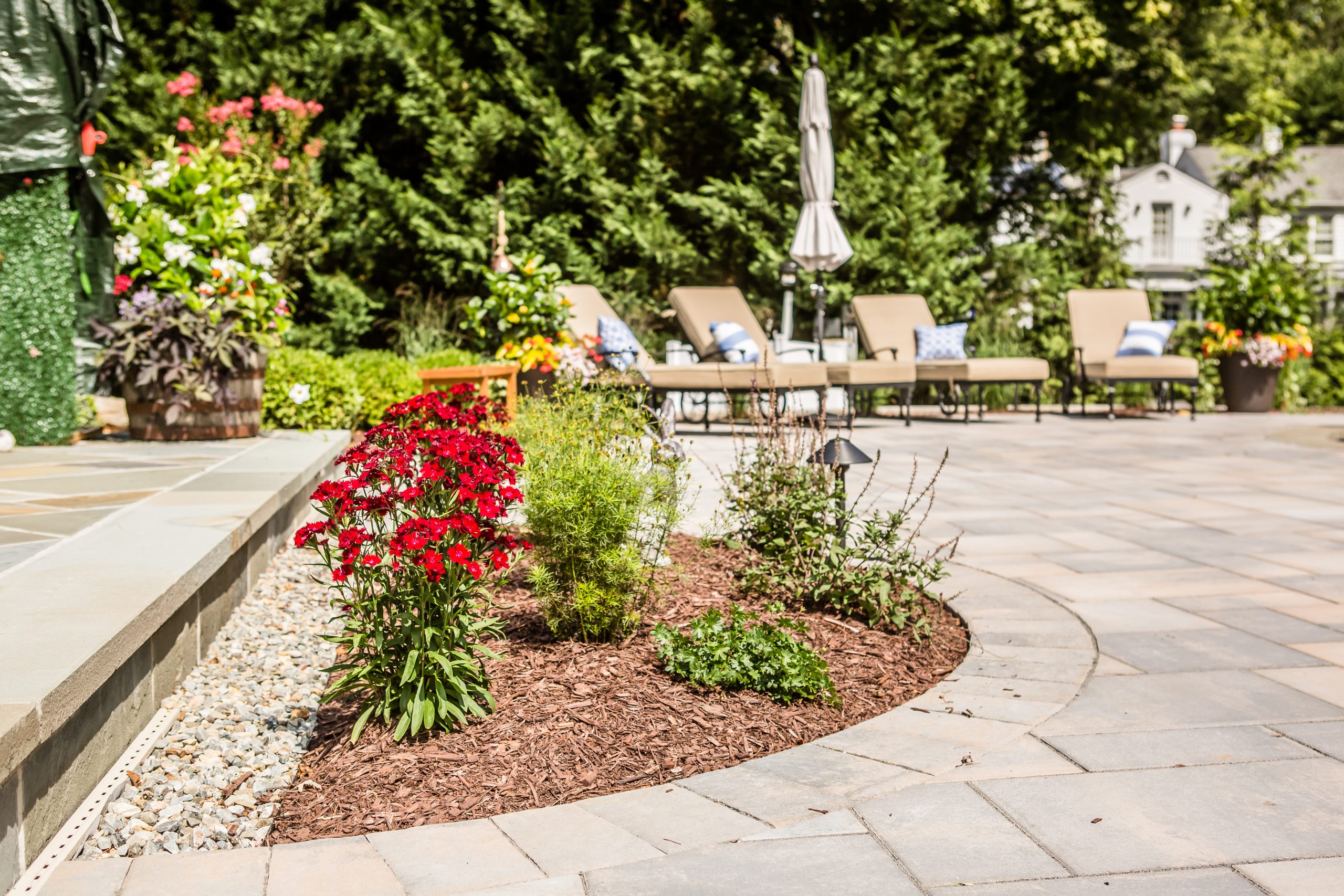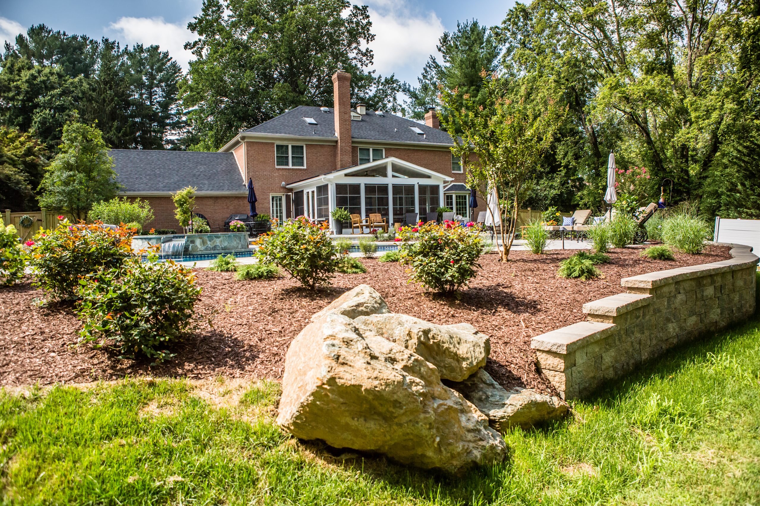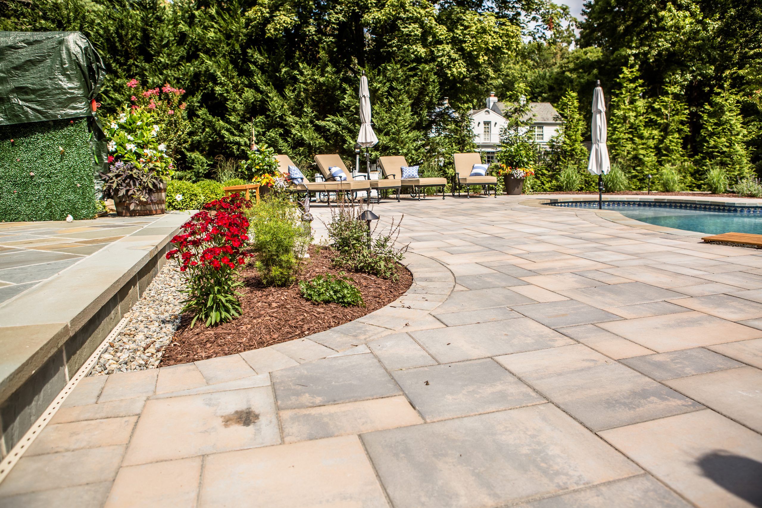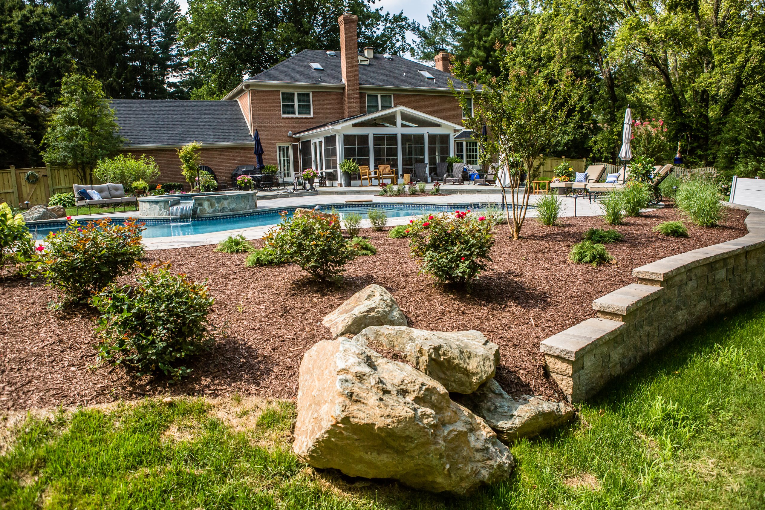 Hometown Landscape completed this backyard project with a custom pool, water feature, coordinated patio, plantings, and mulch. Our team built the pool deck with Unilock Beacon Hill pavers for durability and style, while the flagstone patio and step transitions use Pennsylvania Flagstone, providing a natural, elegant surface for relaxing and entertaining. Thoughtfully placed plantings add structure and color throughout the landscape. Browse the gallery to see how pool design, hardscaping, and landscaping come together in one well-balanced backyard.