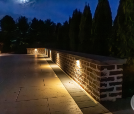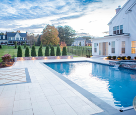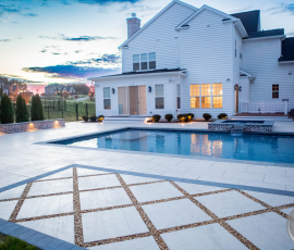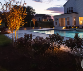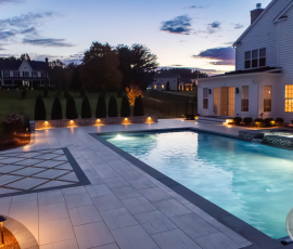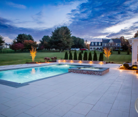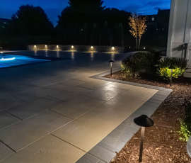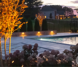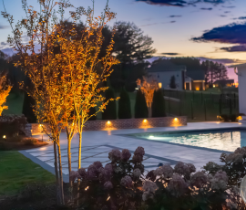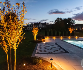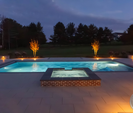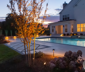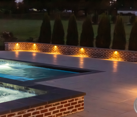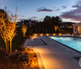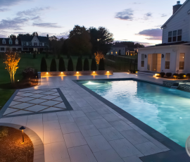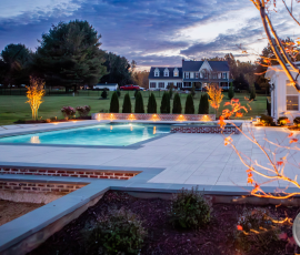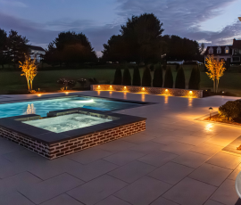 This NALP Award–winning pool and lighting project blends refined masonry work with layered landscape illumination. The design showcases a detailed spa veneer pool surrounded by brick retaining and seating walls, which integrate lighting to enhance nighttime ambiance. Our team constructed the pool deck with Techo-Bloc Raw Travertina pavers, adding crosshatch-patterned pavers and gravel for visual interest. A composite deck and landing link the rear of the home to the pool, creating a smooth indoor-outdoor transition. Landscape beds, plantings, and low-voltage lighting frame the pool deck, uniting the design while highlighting the space after dark. Tour the gallery for inspiration for your next project.