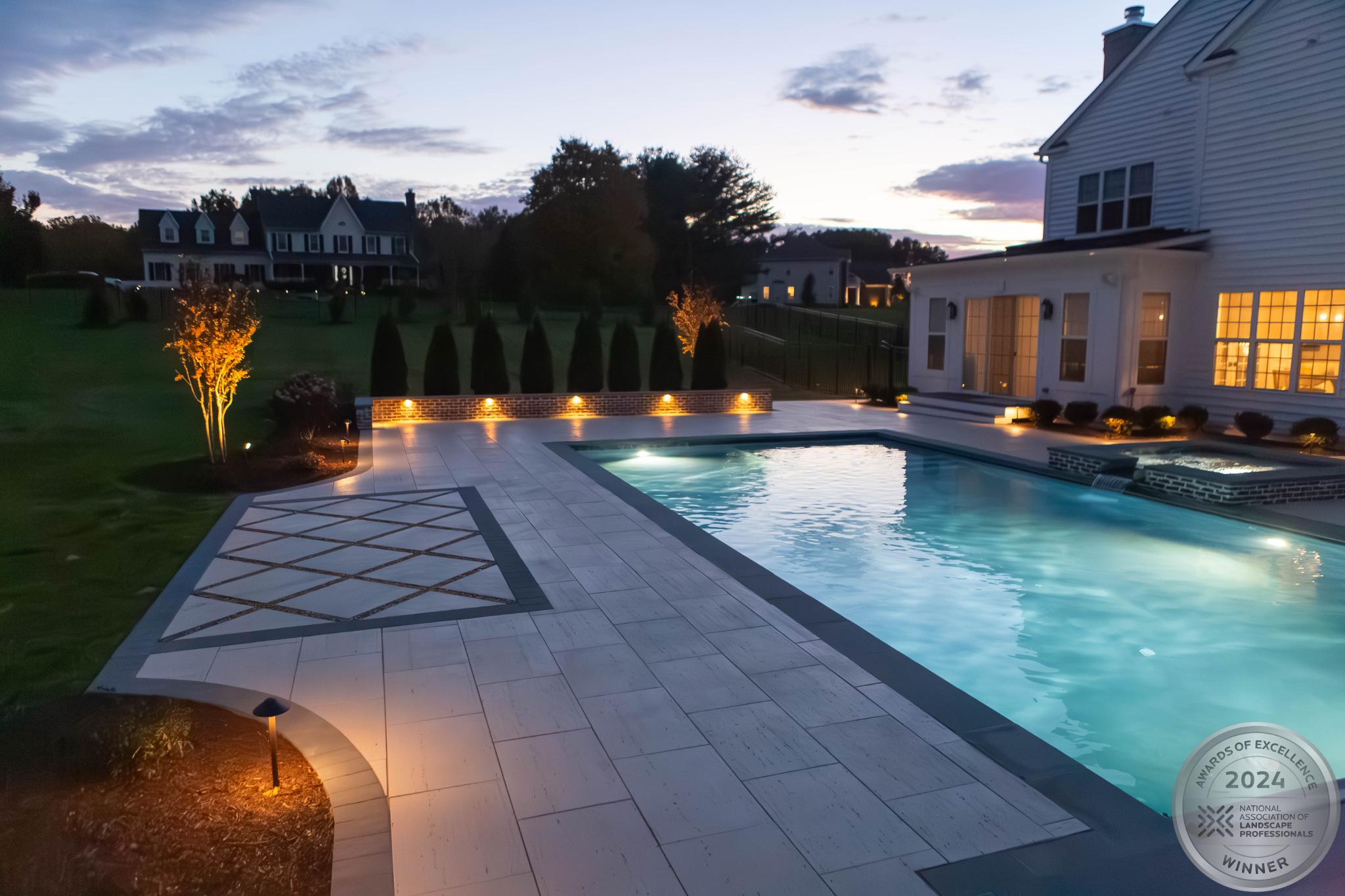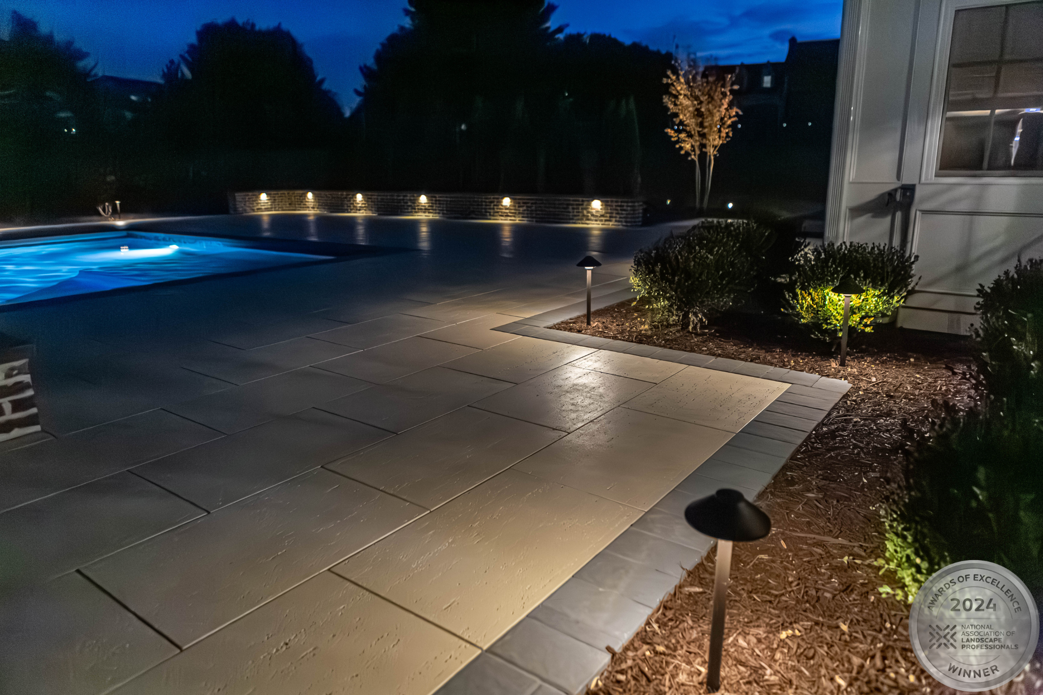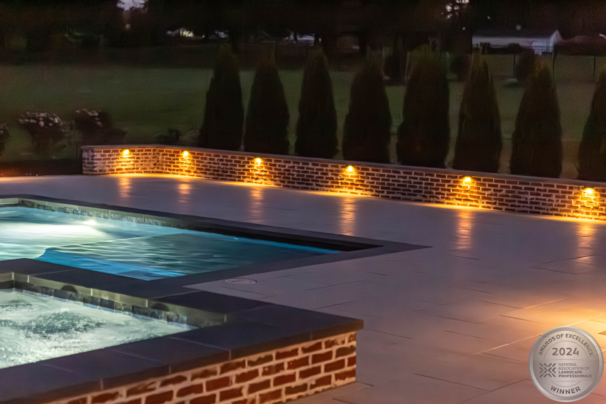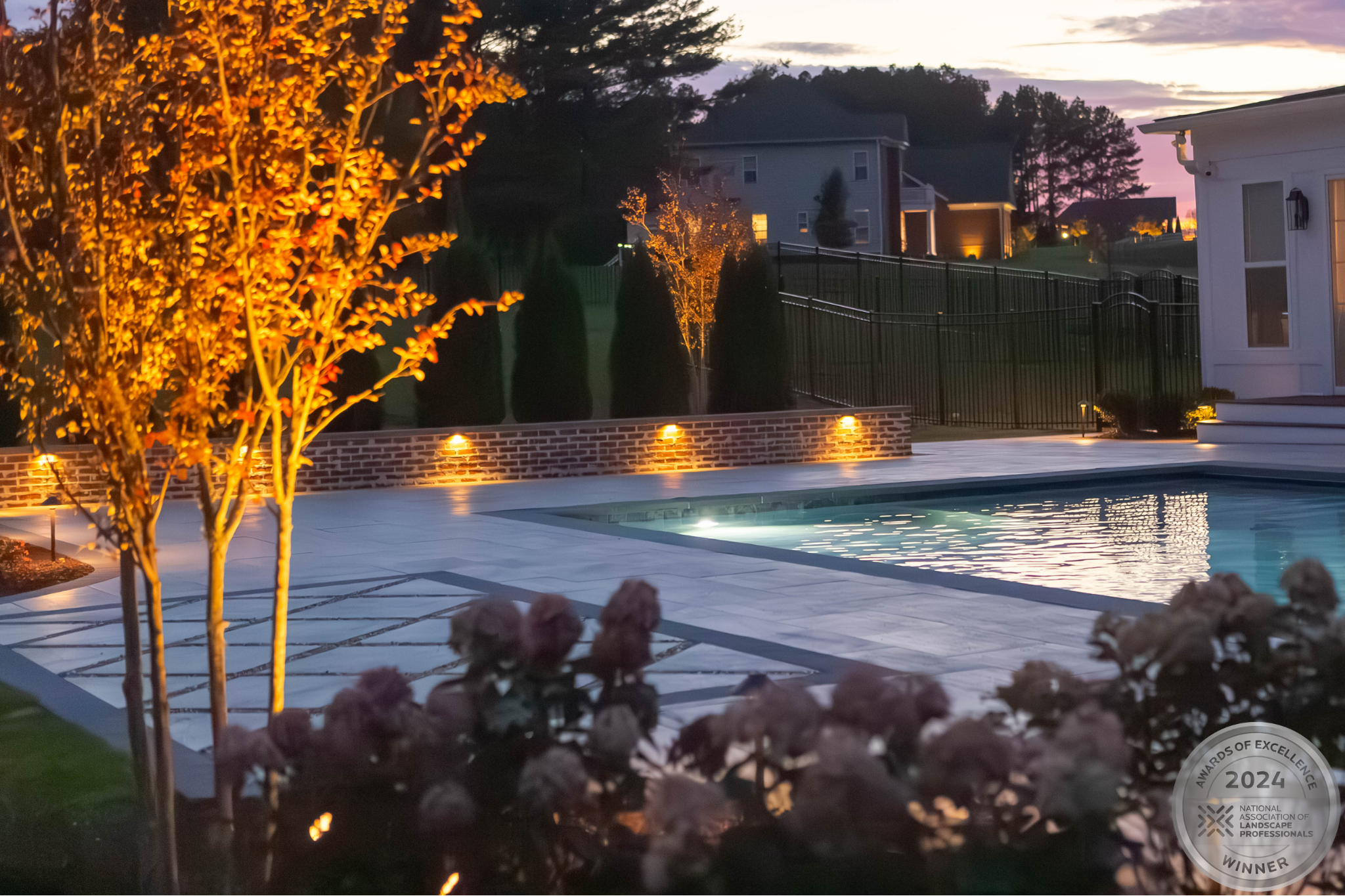 This NALP Award–winning pool and lighting project blends refined masonry work with layered landscape illumination. The design showcases a detailed spa veneer pool surrounded by brick retaining and seating walls, which integrate lighting to enhance nighttime ambiance. Our team constructed the pool deck with Techo-Bloc Raw Travertina pavers, adding crosshatch-patterned pavers and gravel for visual interest. A composite deck and landing link the rear of the home to the pool, creating a smooth indoor-outdoor transition. Landscape beds, plantings, and low-voltage lighting frame the pool deck, uniting the design while highlighting the space after dark. Tour the gallery for inspiration for your next project.