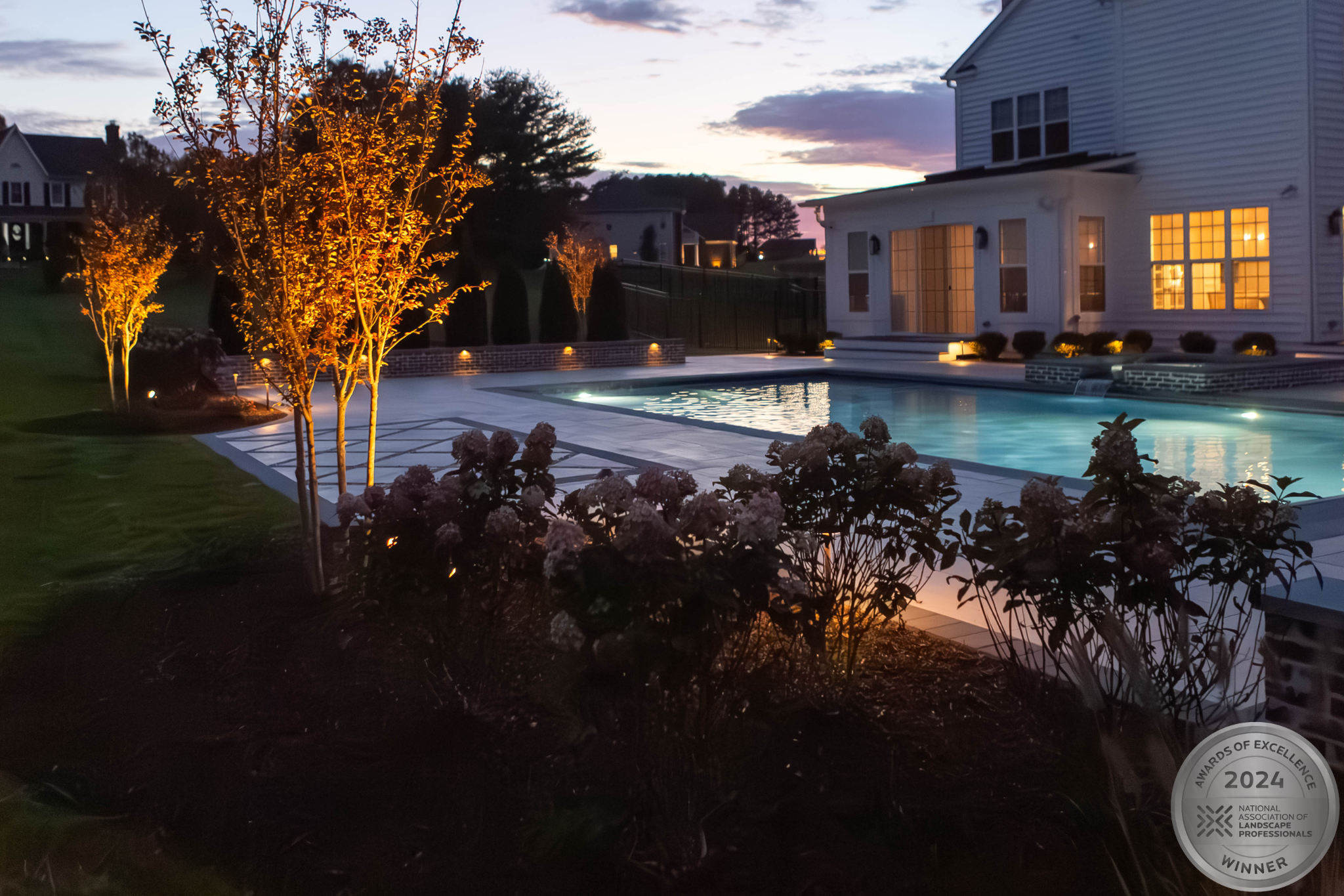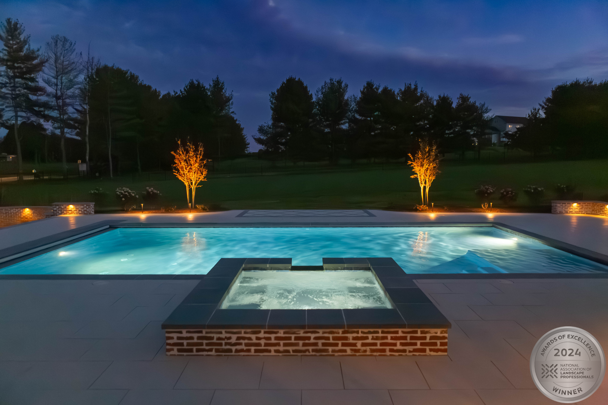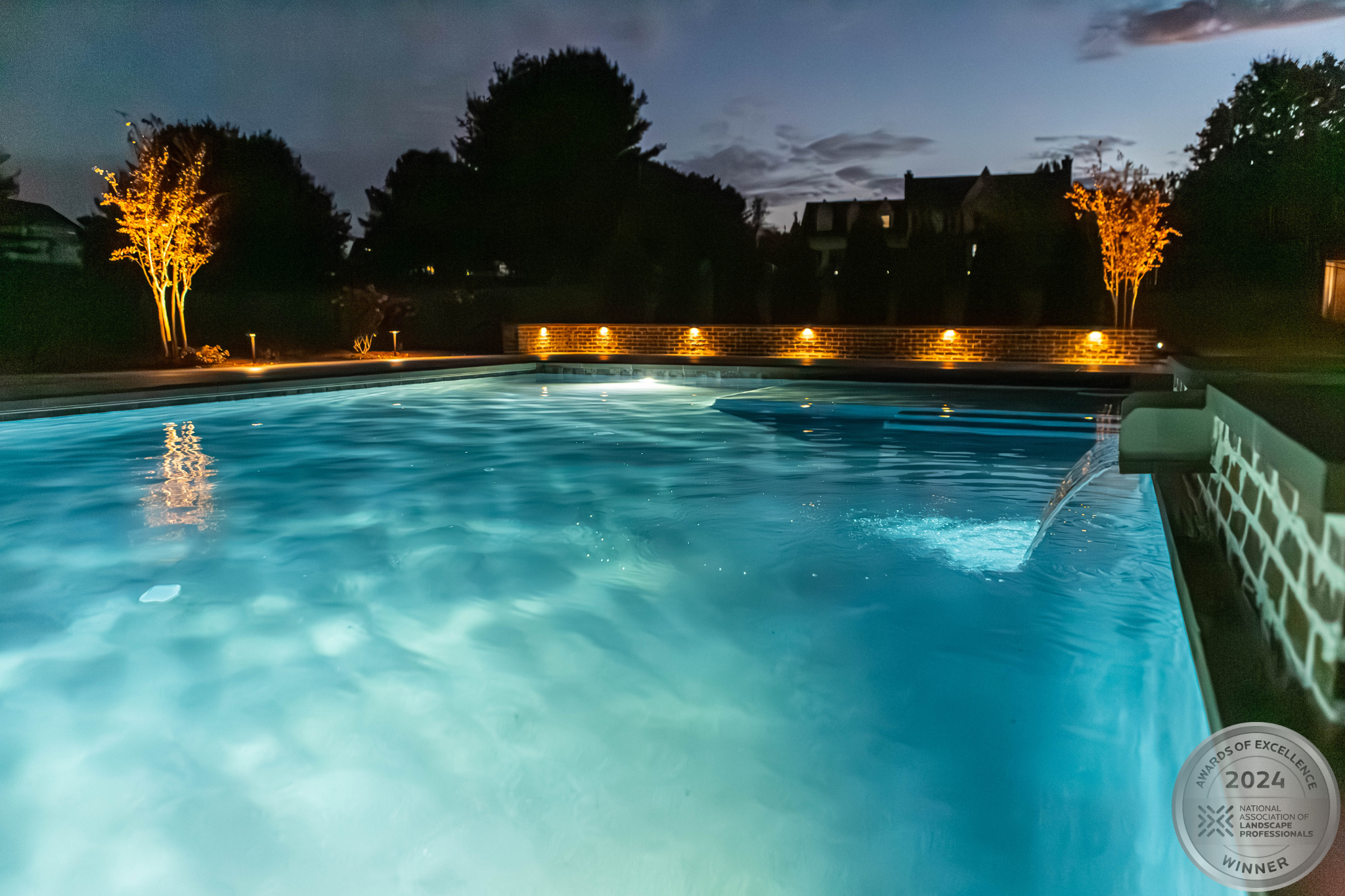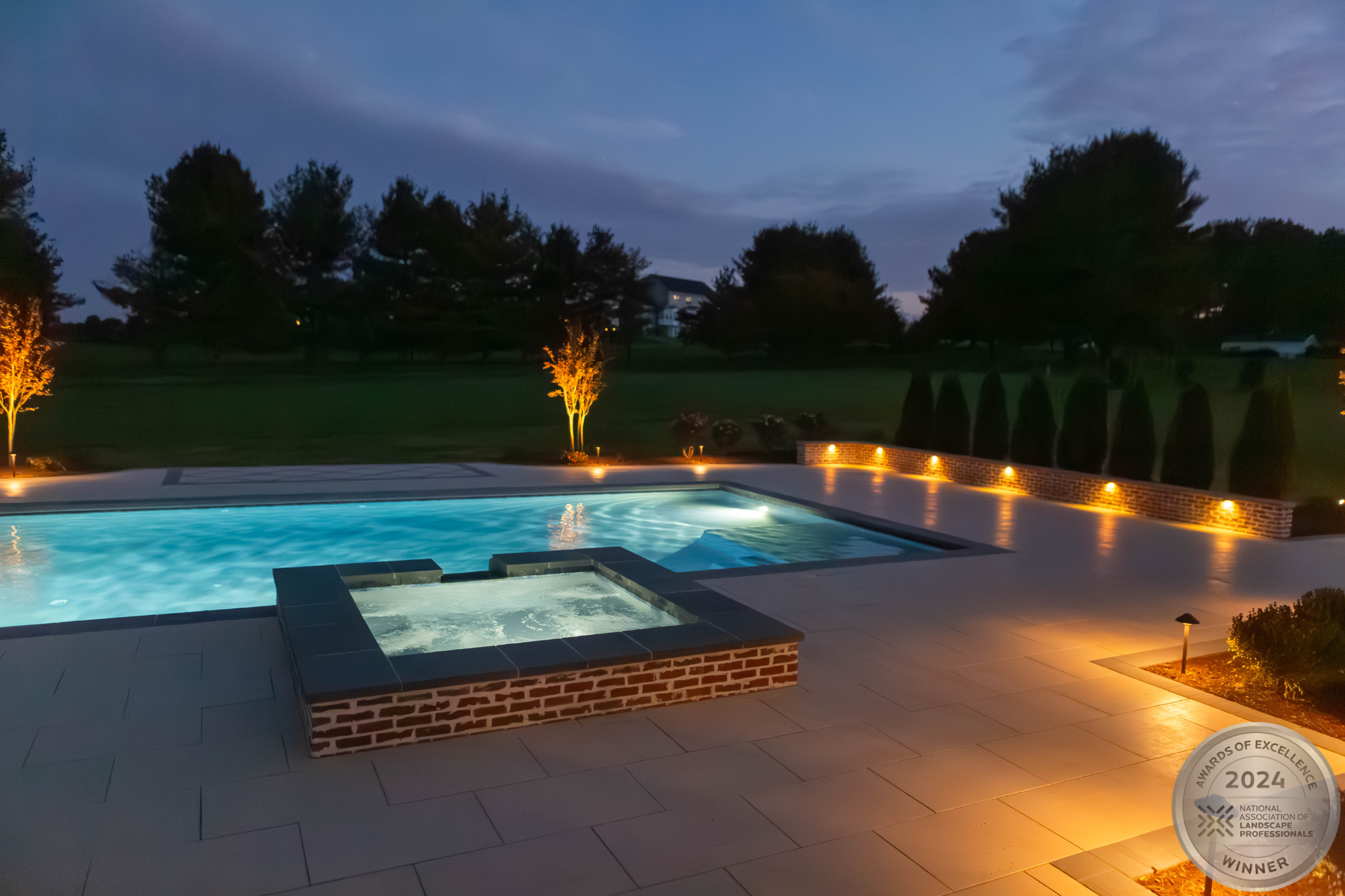 This NALP Award–winning pool and lighting project blends refined masonry work with layered landscape illumination. The design showcases a detailed spa veneer pool surrounded by brick retaining and seating walls, which integrate lighting to enhance nighttime ambiance. Our team constructed the pool deck with Techo-Bloc Raw Travertina pavers, adding crosshatch-patterned pavers and gravel for visual interest. A composite deck and landing link the rear of the home to the pool, creating a smooth indoor-outdoor transition. Landscape beds, plantings, and low-voltage lighting frame the pool deck, uniting the design while highlighting the space after dark. Tour the gallery for inspiration for your next project.