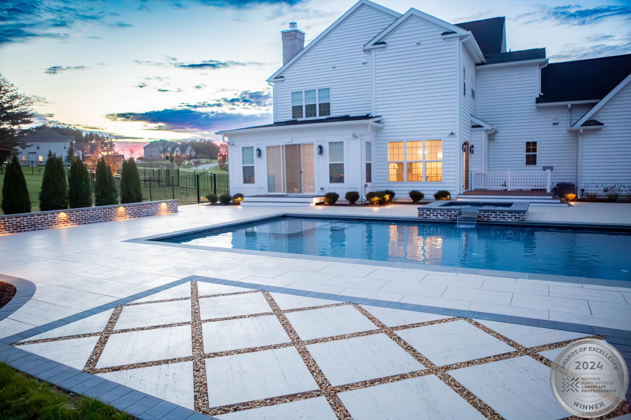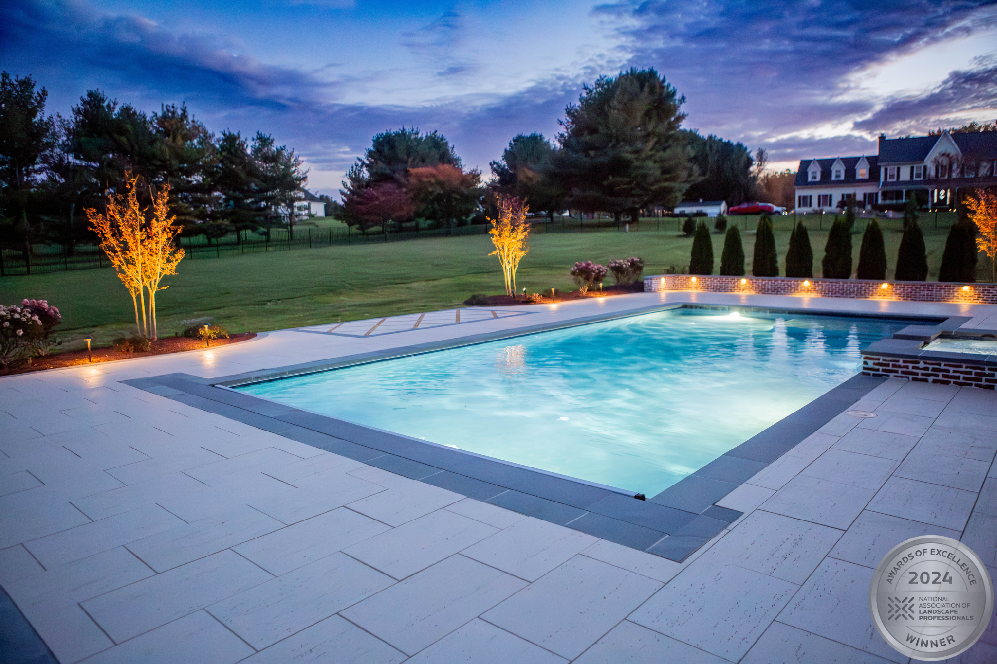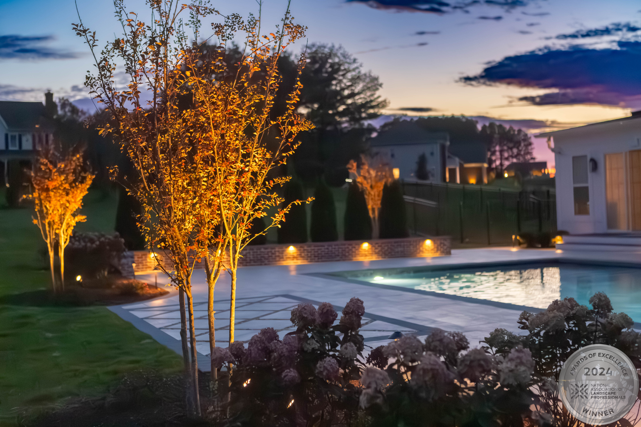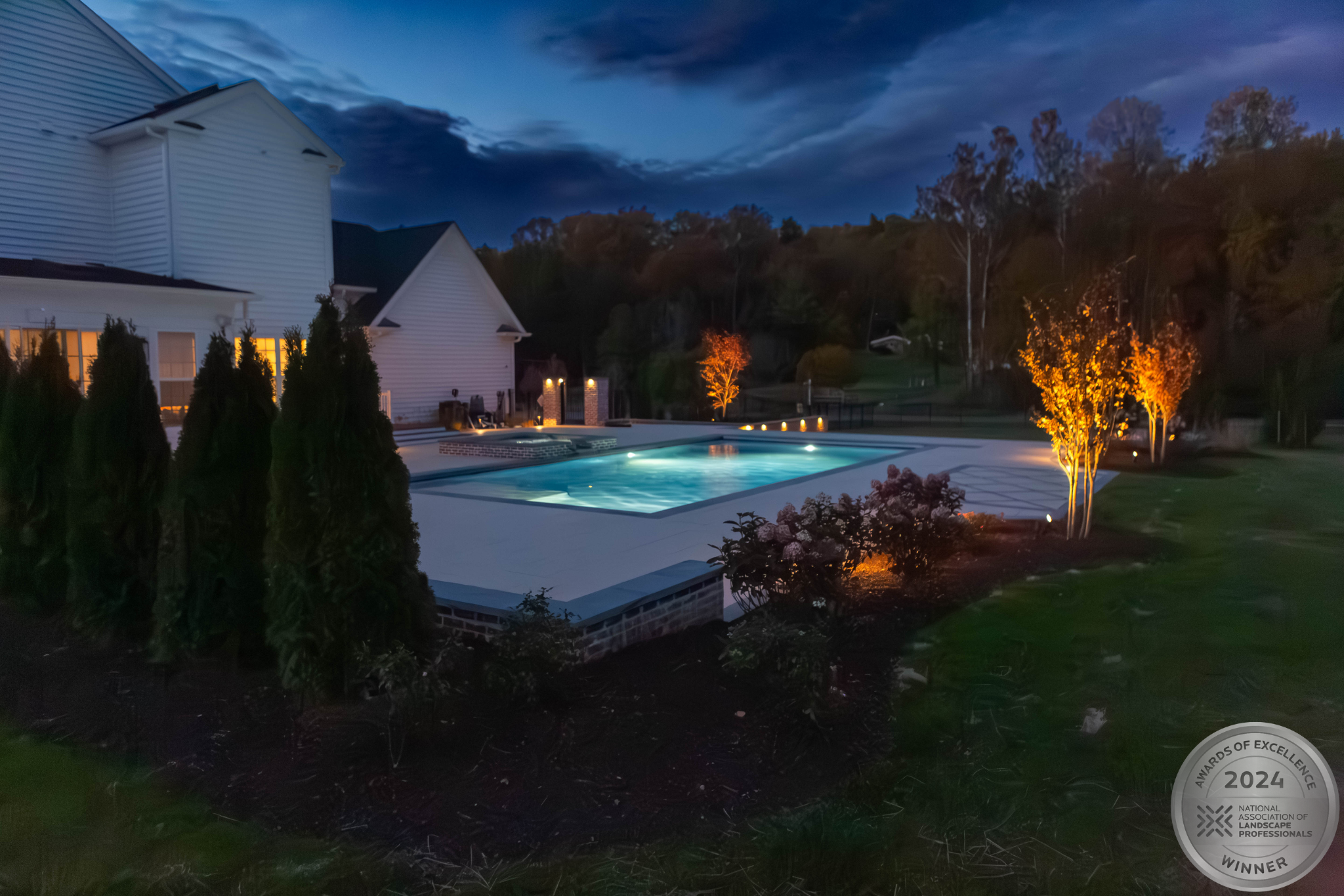 This NALP Award–winning pool and lighting project blends refined masonry work with layered landscape illumination. The design showcases a detailed spa veneer pool surrounded by brick retaining and seating walls, which integrate lighting to enhance nighttime ambiance. Our team constructed the pool deck with Techo-Bloc Raw Travertina pavers, adding crosshatch-patterned pavers and gravel for visual interest. A composite deck and landing link the rear of the home to the pool, creating a smooth indoor-outdoor transition. Landscape beds, plantings, and low-voltage lighting frame the pool deck, uniting the design while highlighting the space after dark. Tour the gallery for inspiration for your next project.