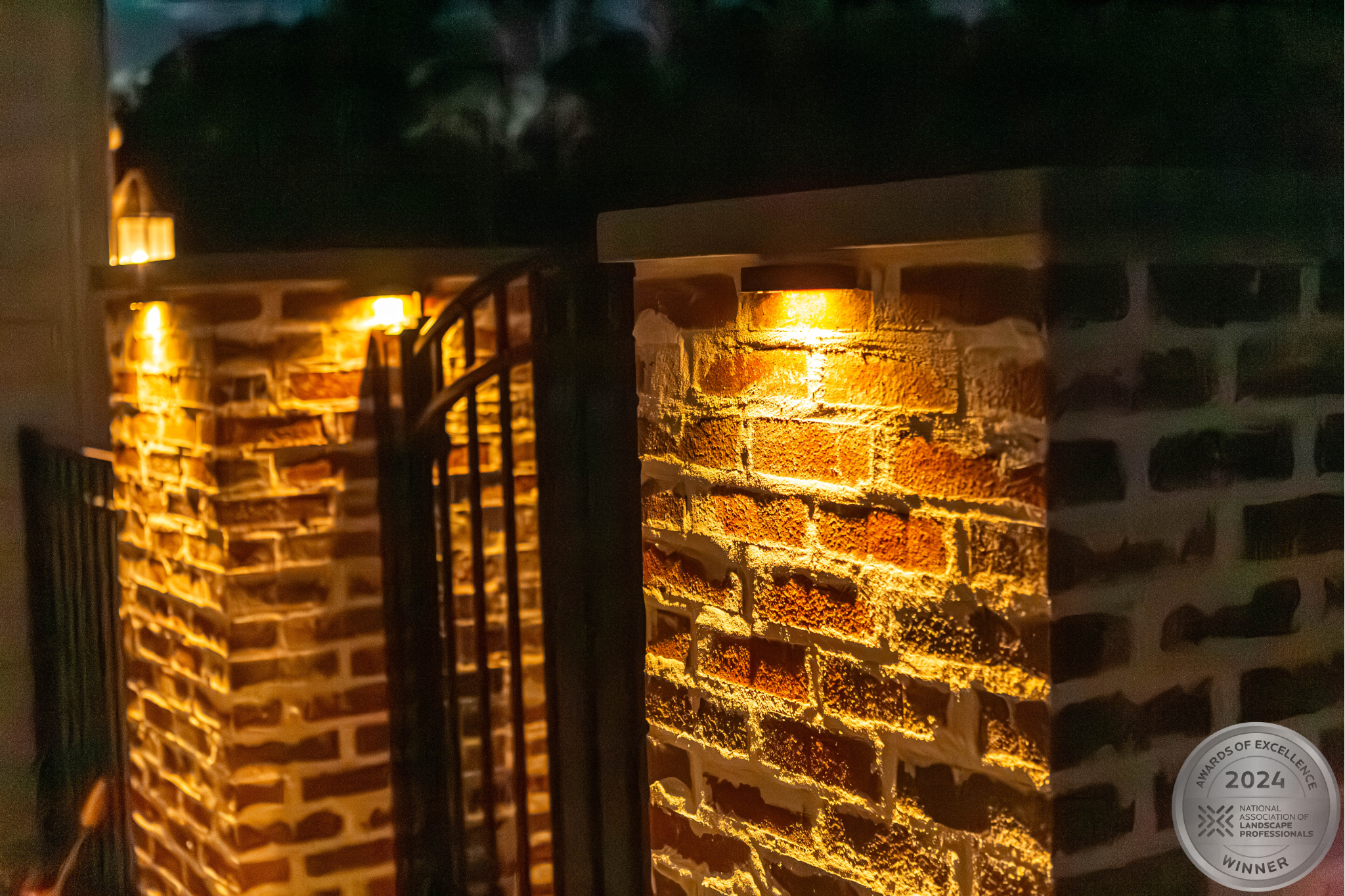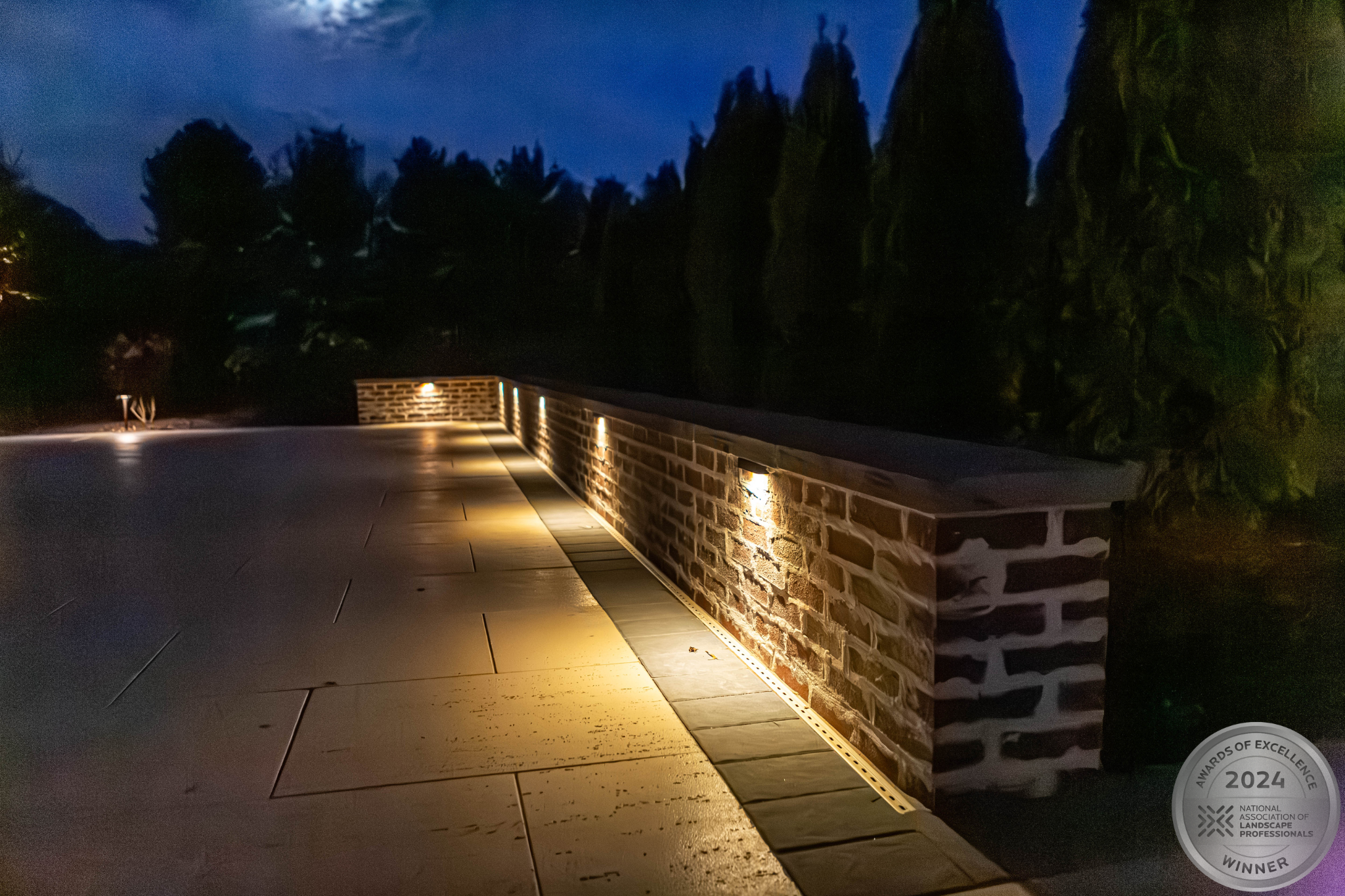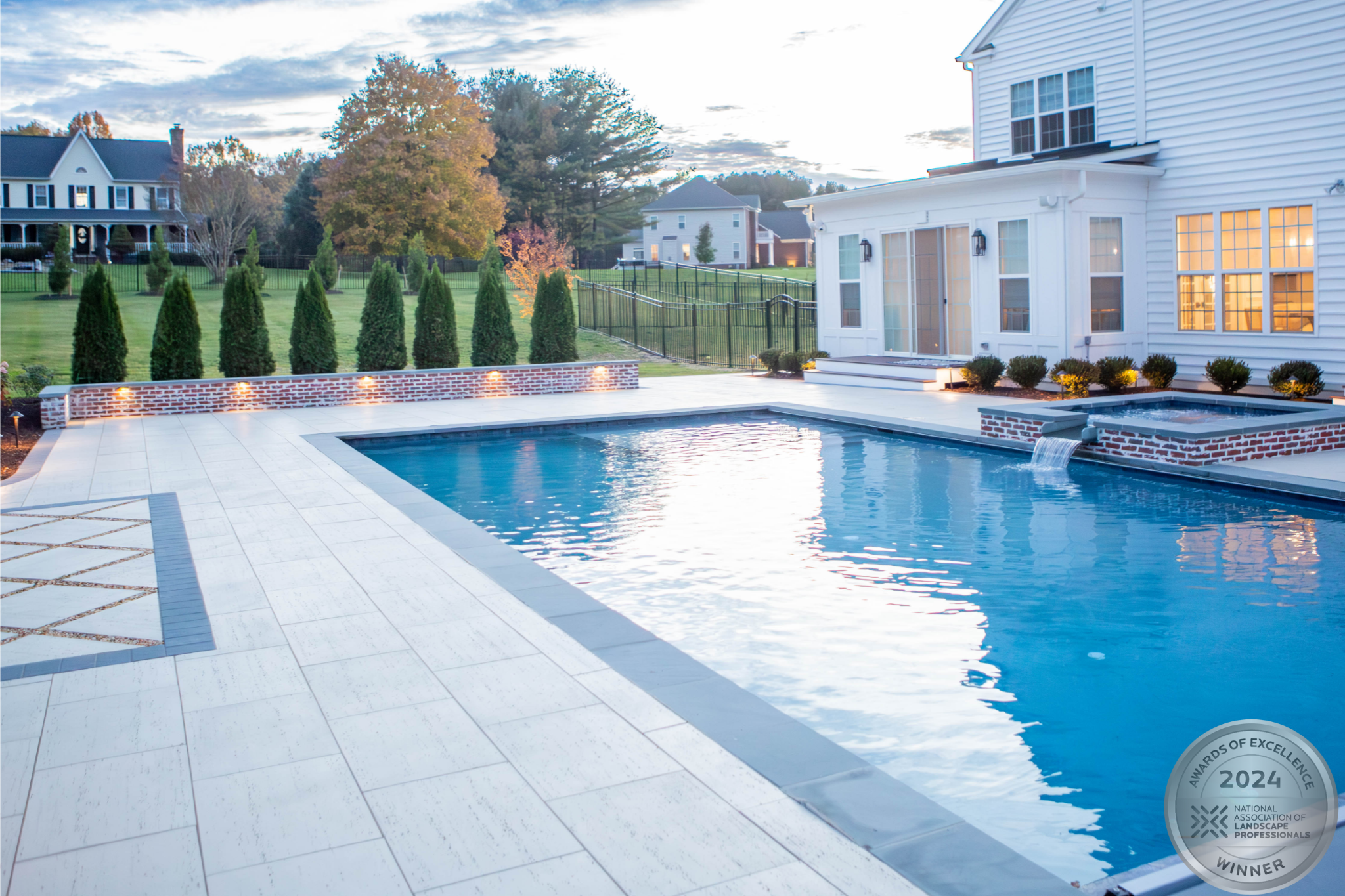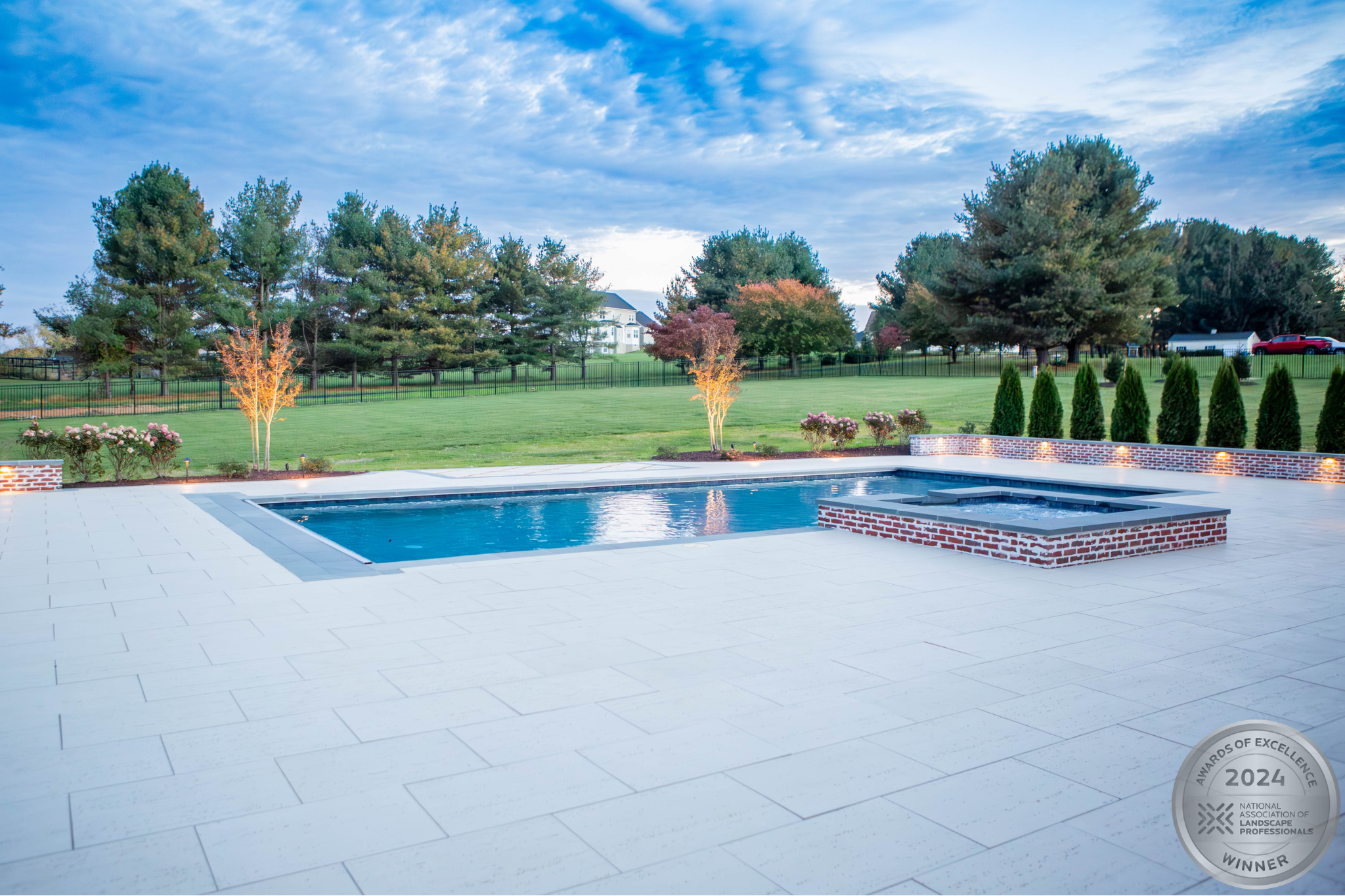 This NALP Award–winning pool and lighting project blends refined masonry work with layered landscape illumination. The design showcases a detailed spa veneer pool surrounded by brick retaining and seating walls, which integrate lighting to enhance nighttime ambiance. Our team constructed the pool deck with Techo-Bloc Raw Travertina pavers, adding crosshatch-patterned pavers and gravel for visual interest. A composite deck and landing link the rear of the home to the pool, creating a smooth indoor-outdoor transition. Landscape beds, plantings, and low-voltage lighting frame the pool deck, uniting the design while highlighting the space after dark. Tour the gallery for inspiration for your next project.