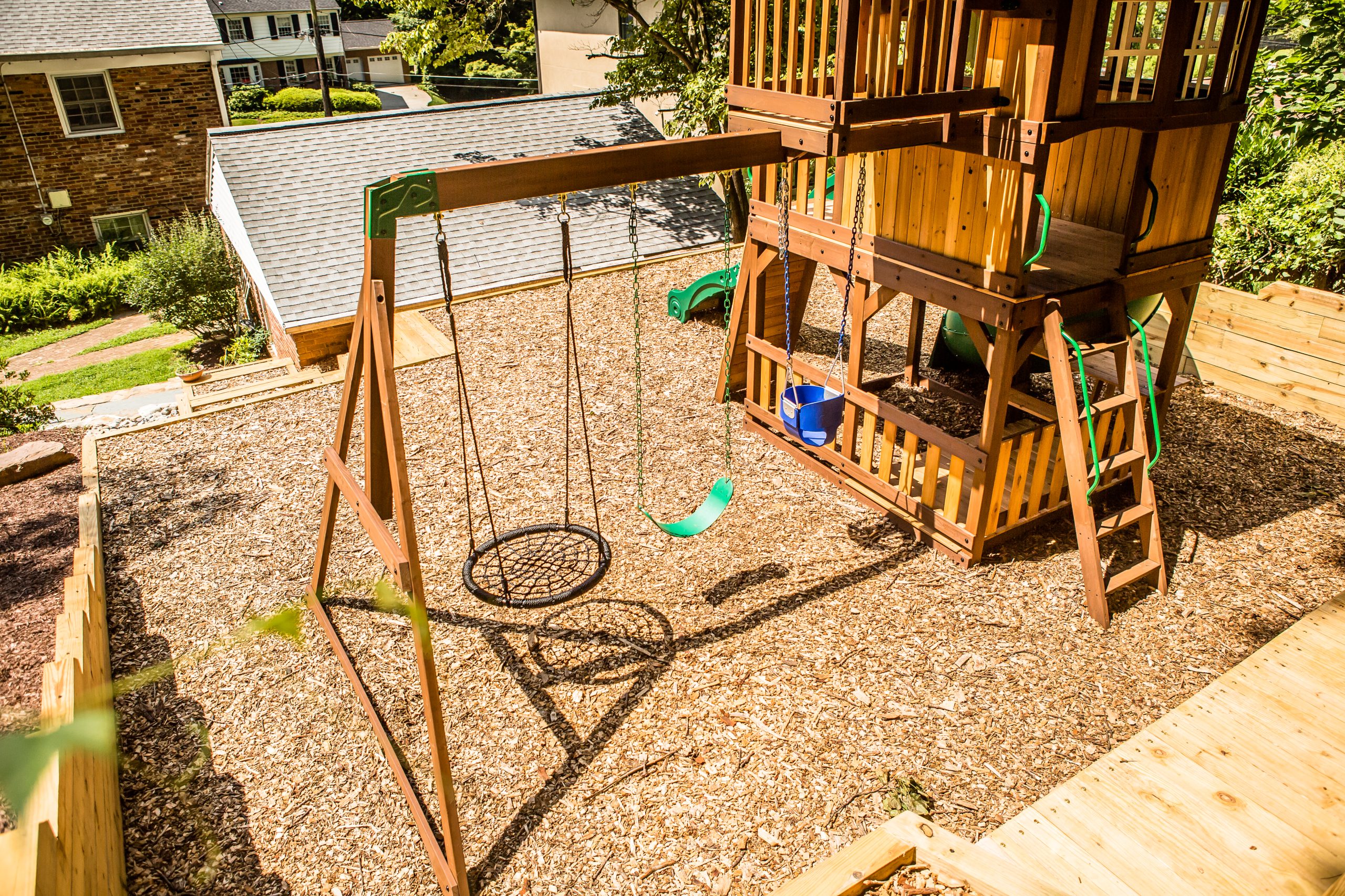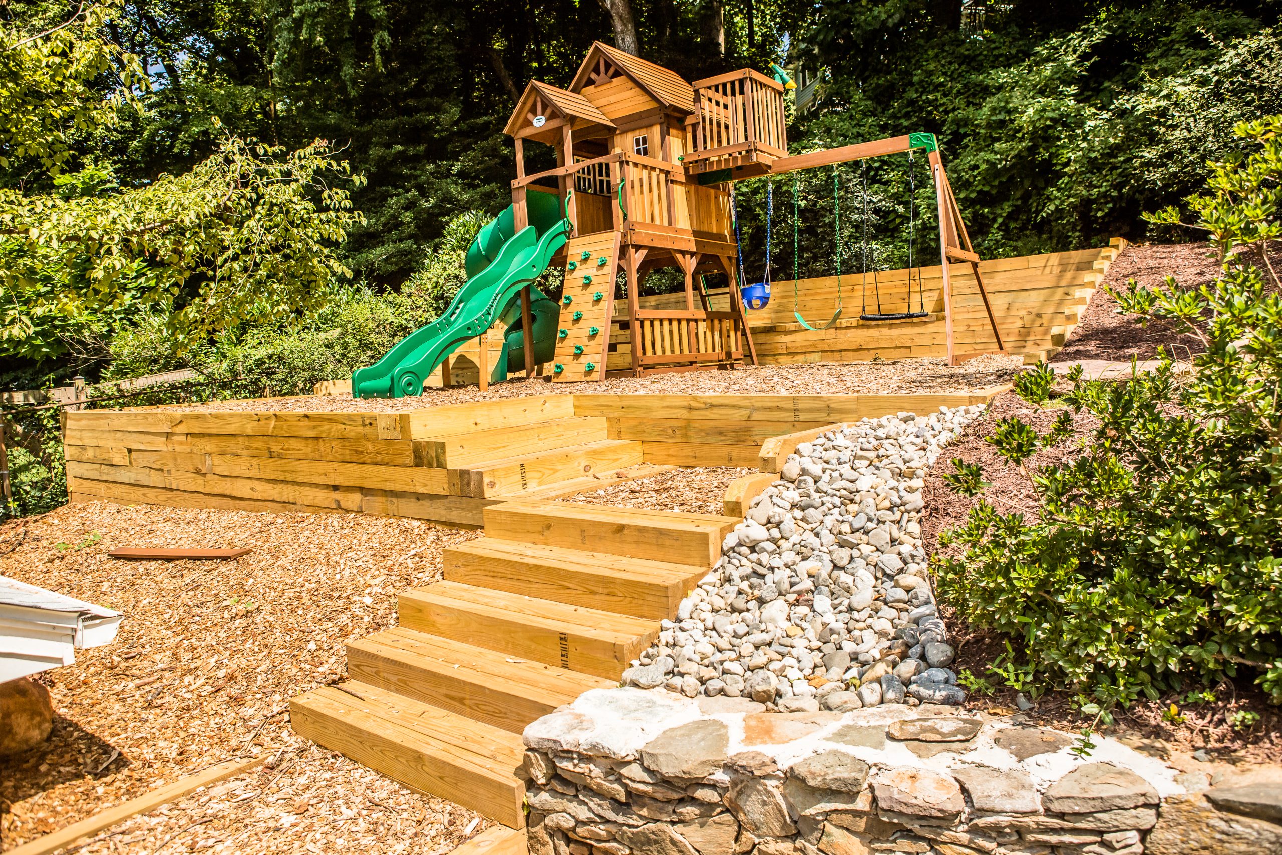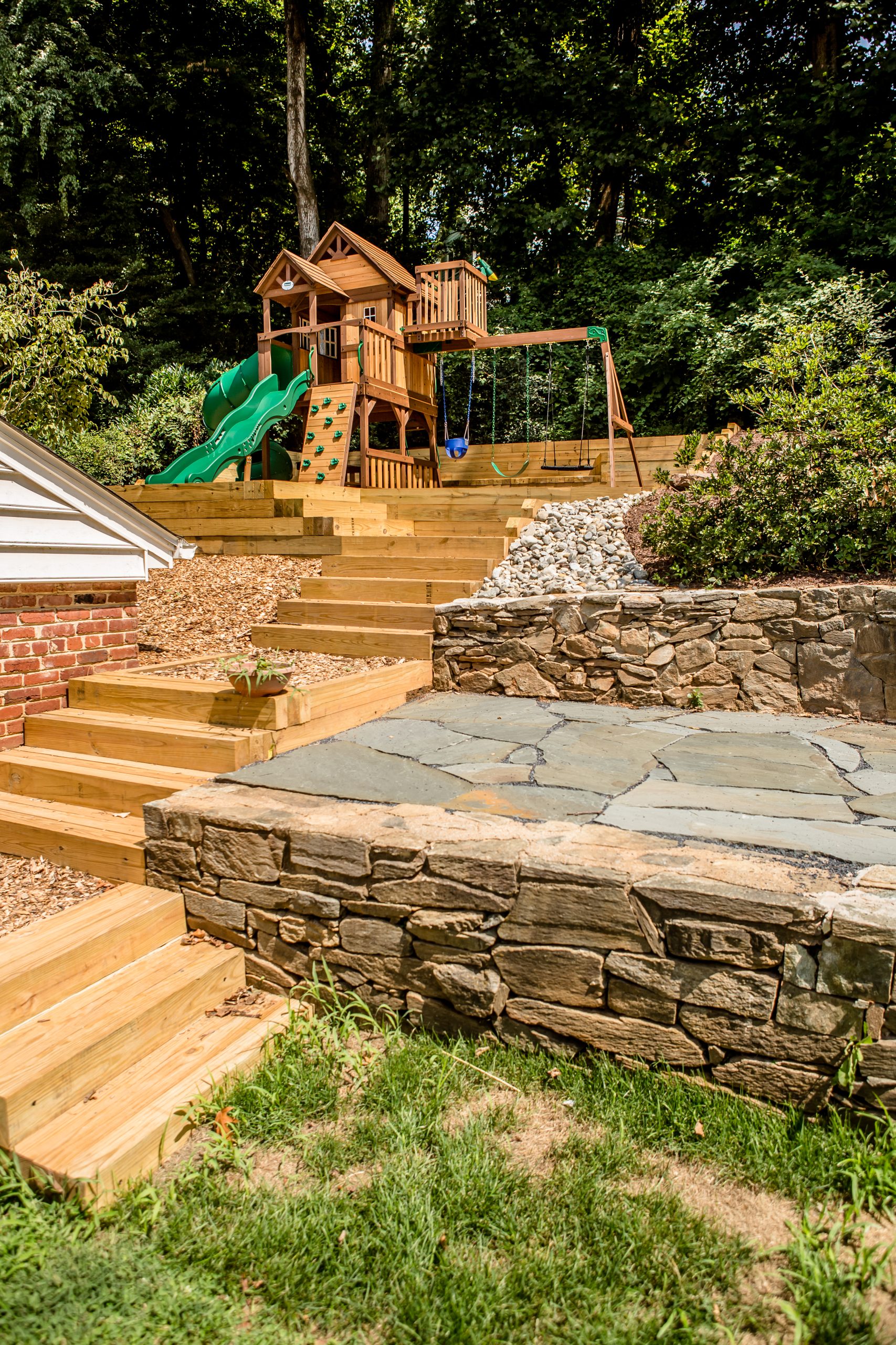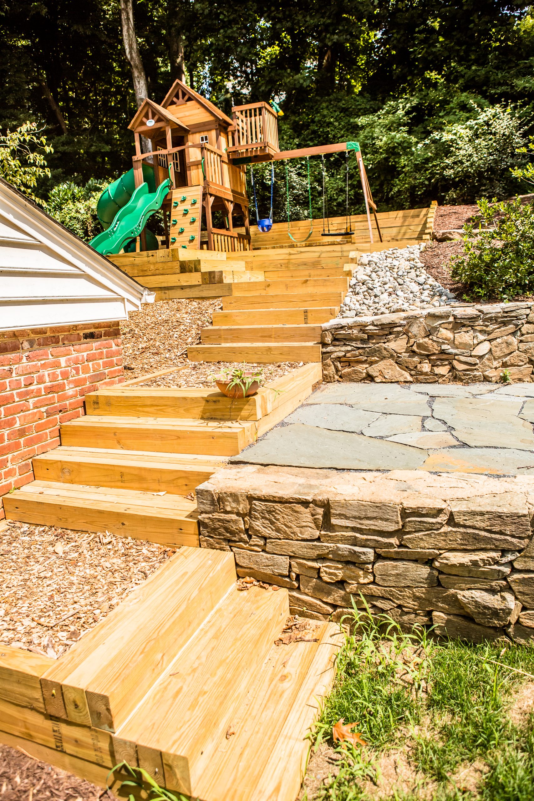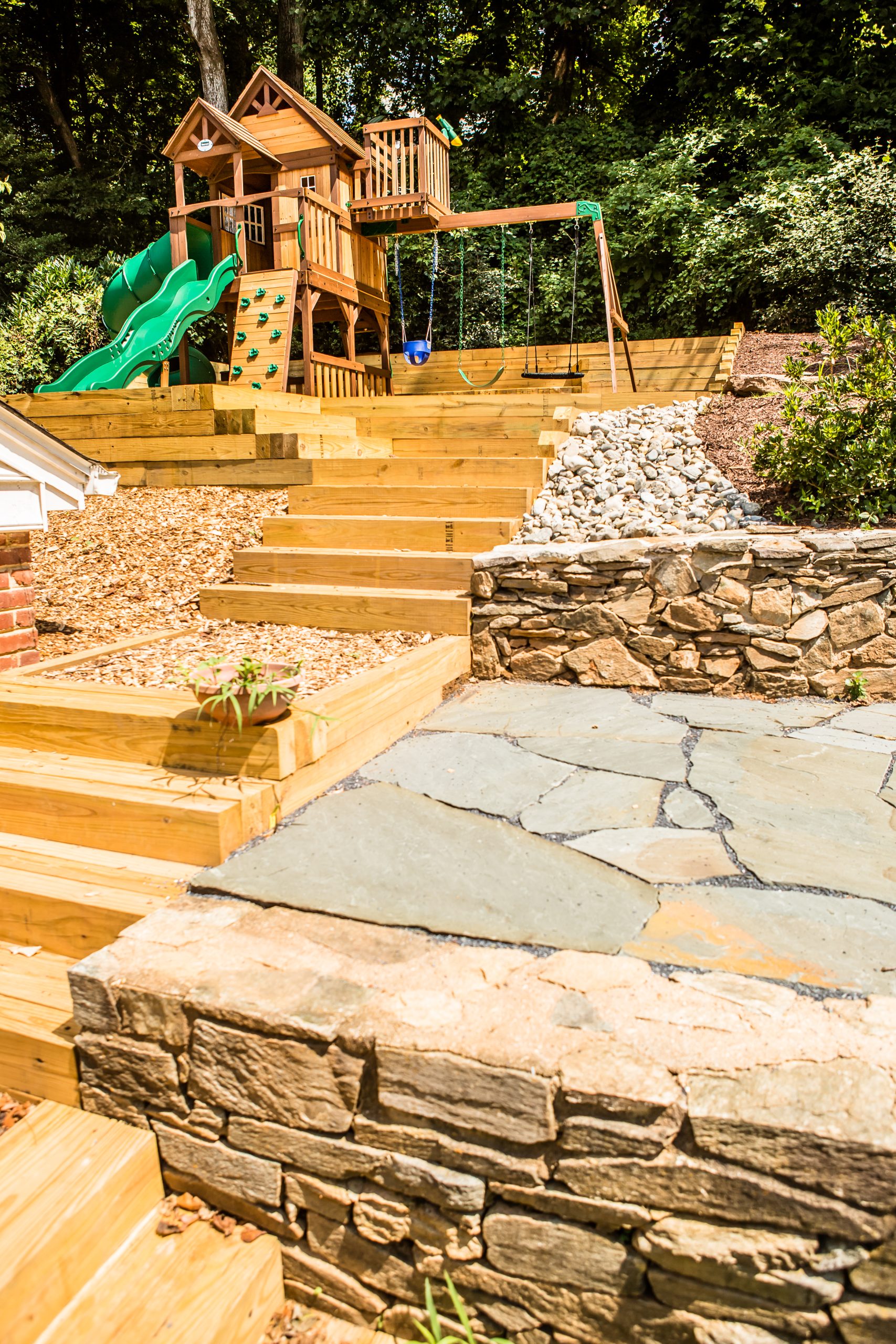 Hometown Landscape transformed a sloped backyard into a beautiful, practical space with steps, tiered garden beds, and a playset for the family.