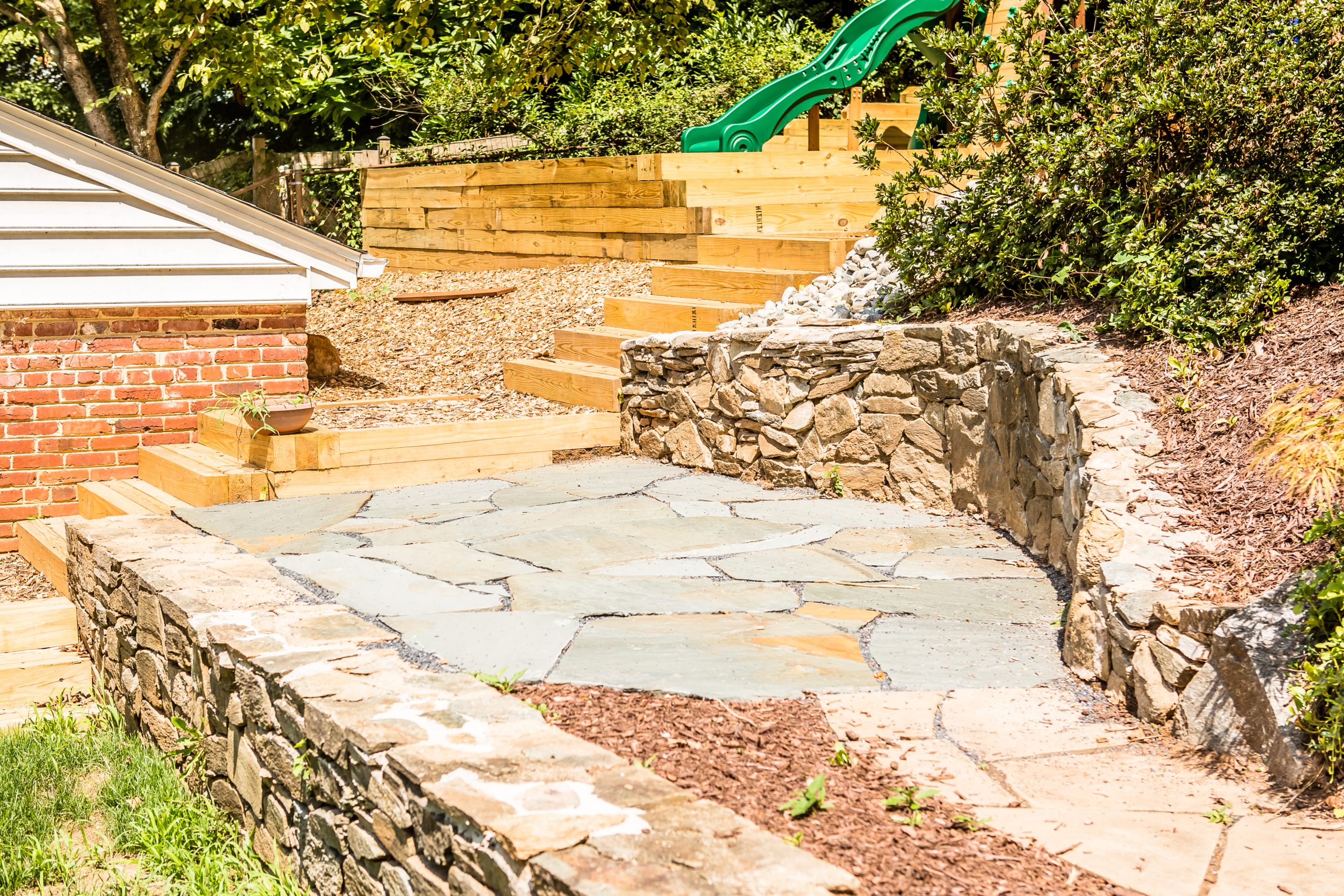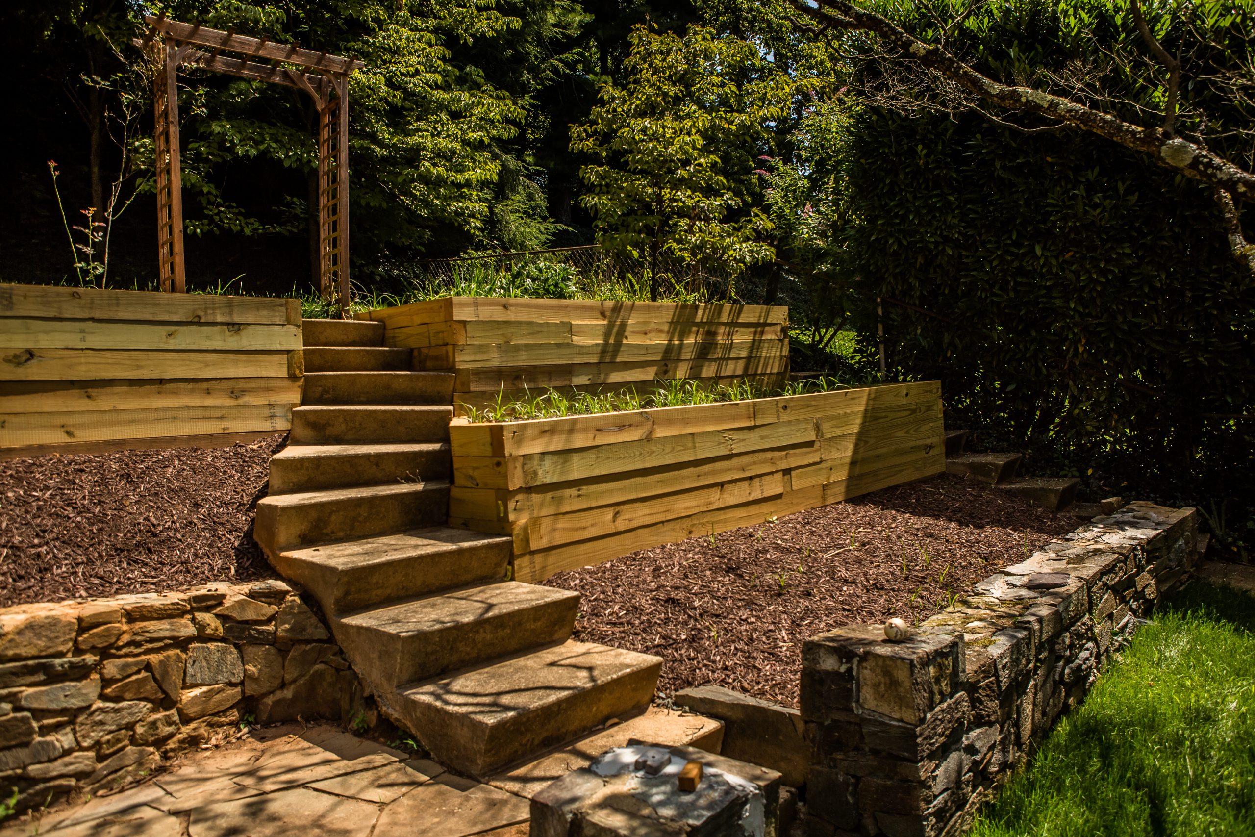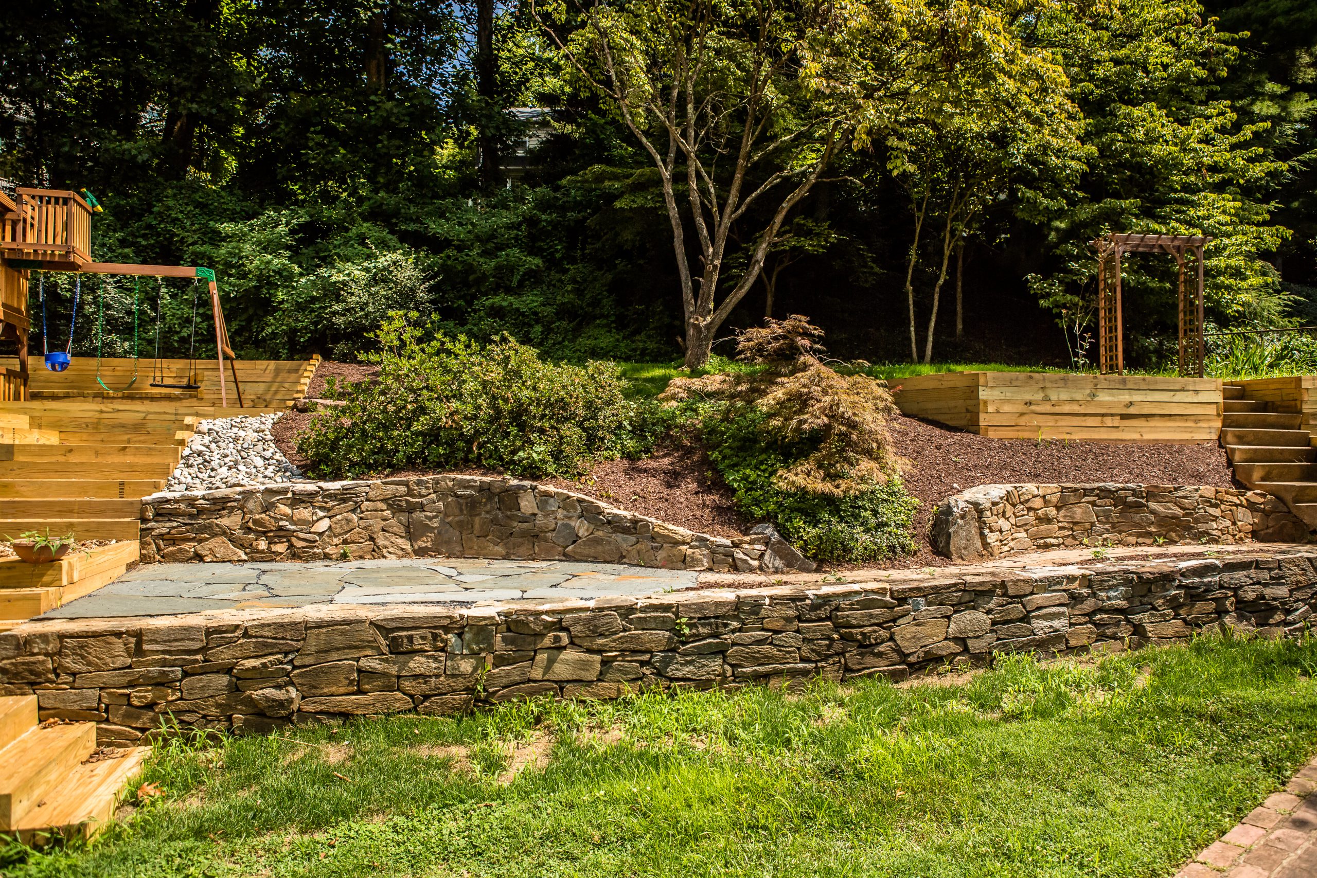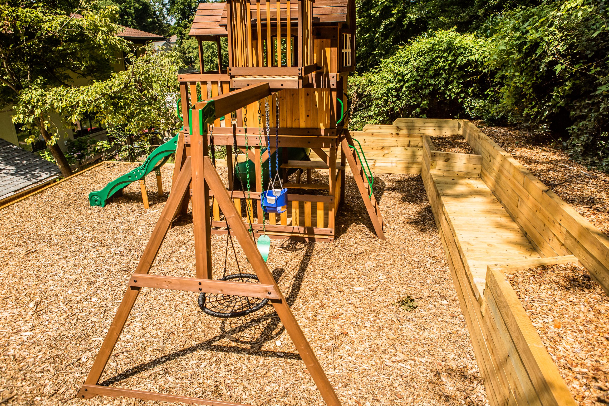 Hometown Landscape transformed a sloped backyard into a beautiful, practical space with steps, tiered garden beds, and a playset for the family.