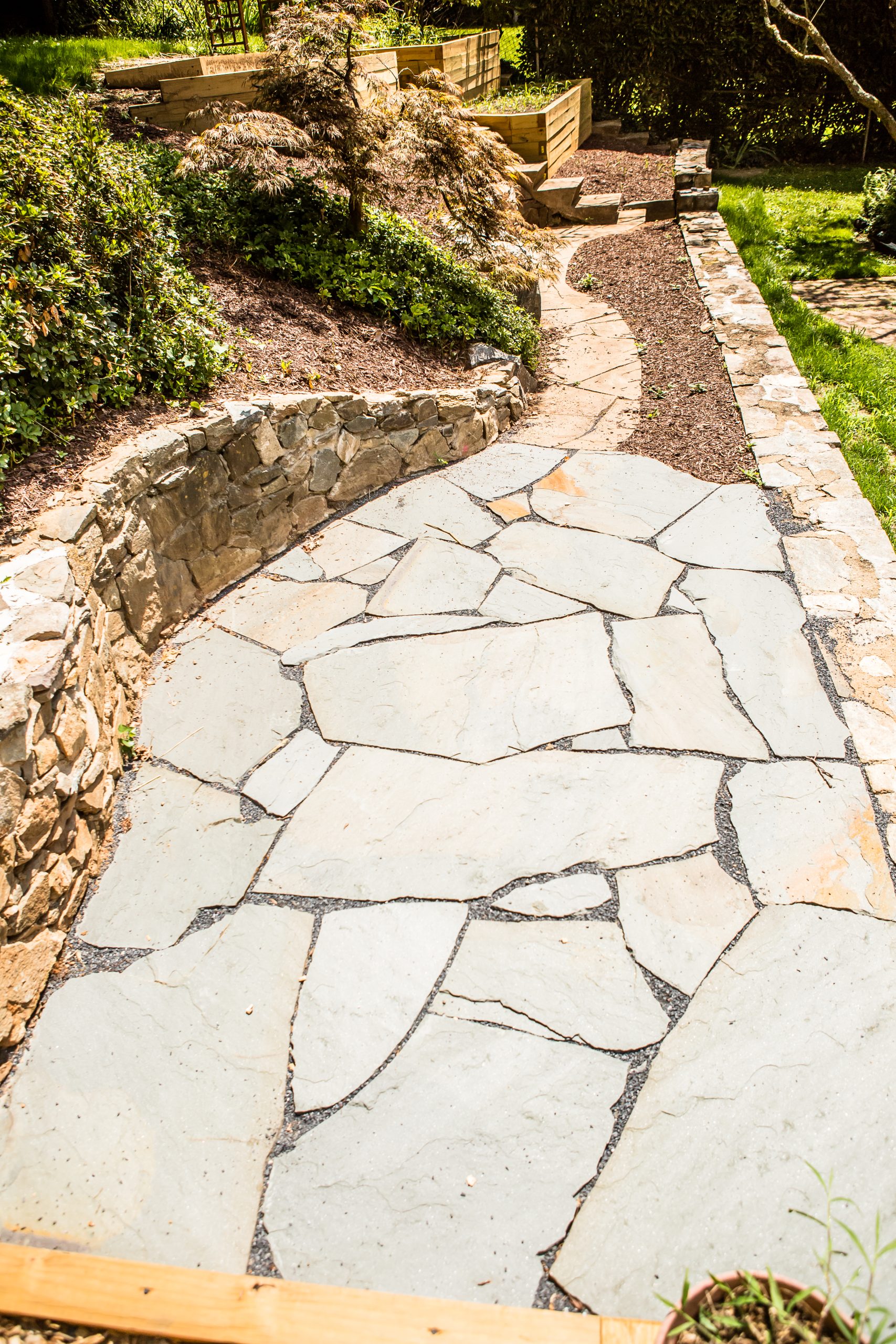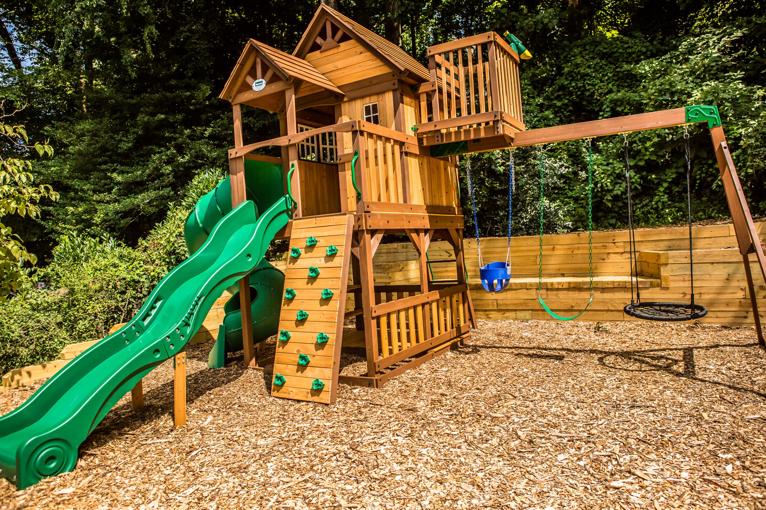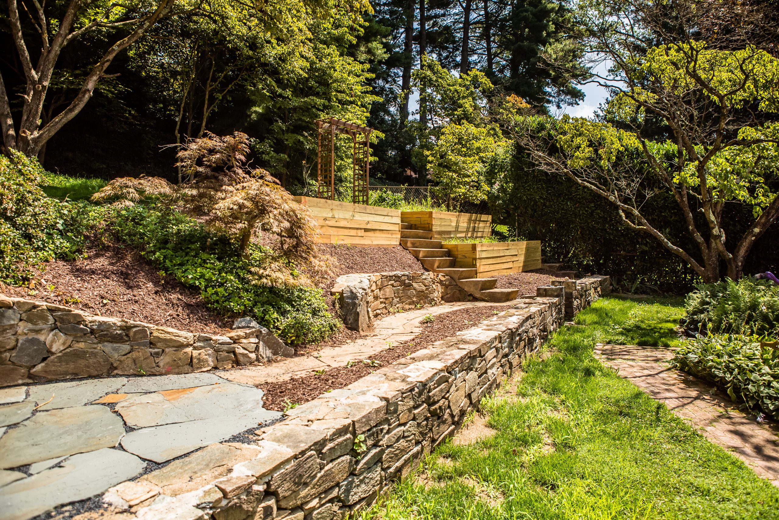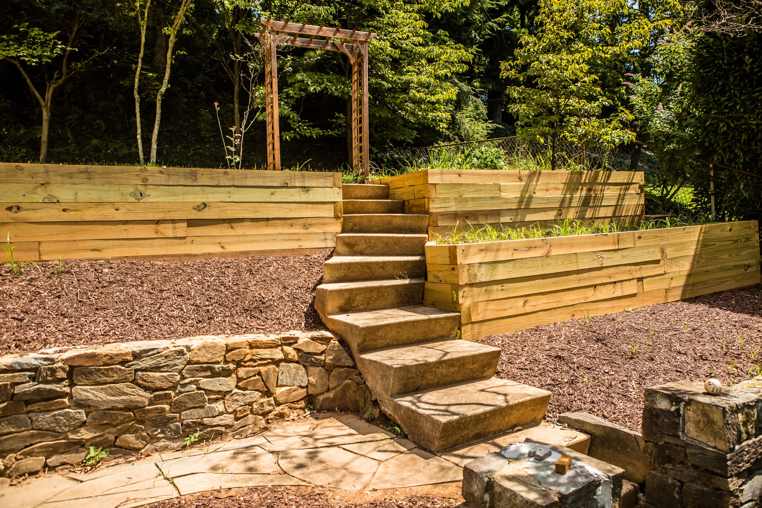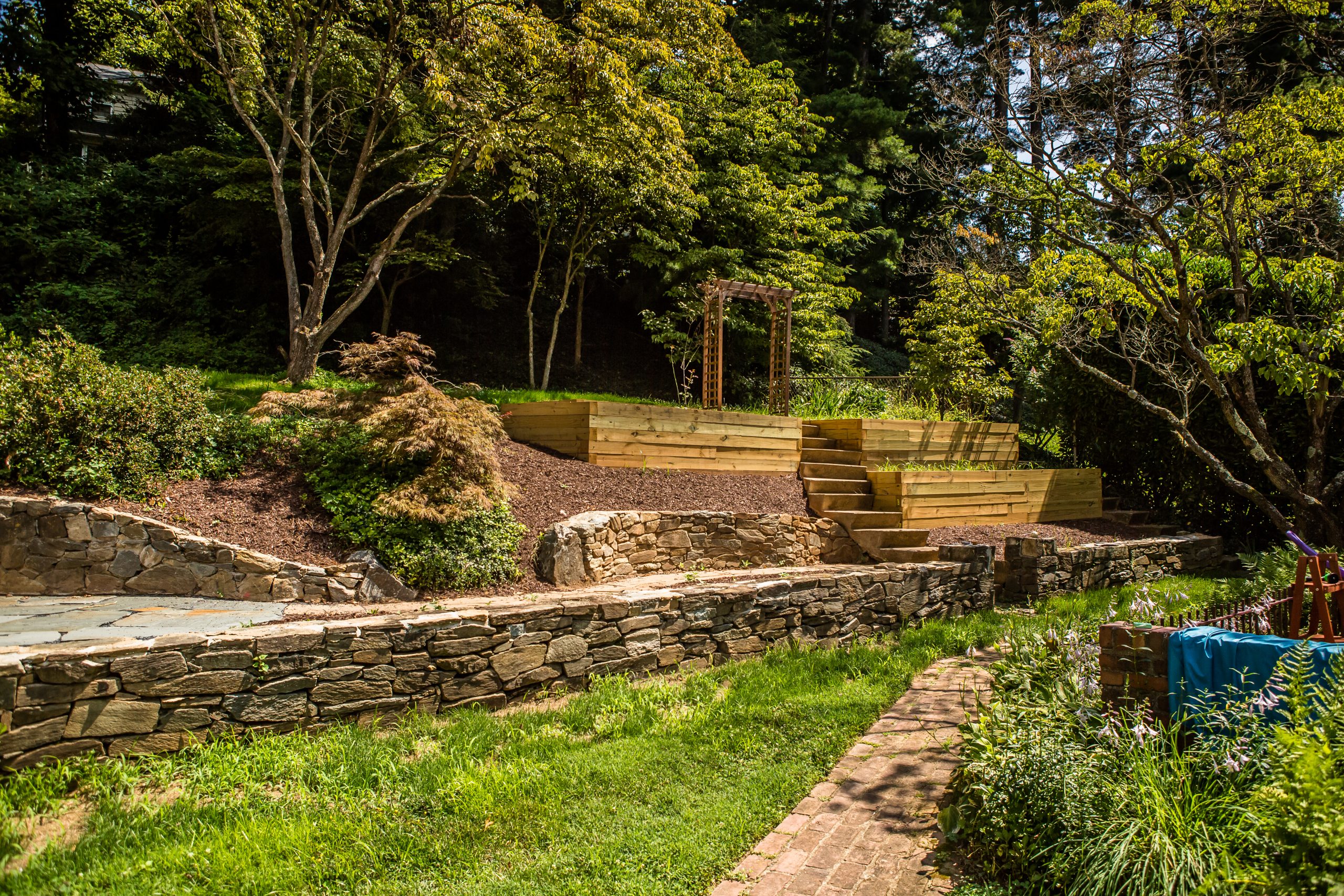 Hometown Landscape transformed a sloped backyard into a beautiful, practical space with steps, tiered garden beds, and a playset for the family.