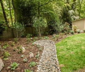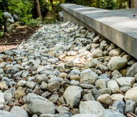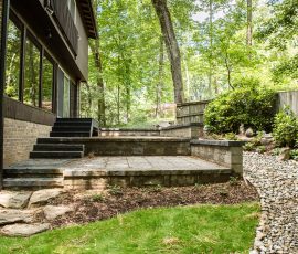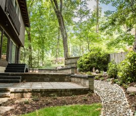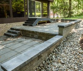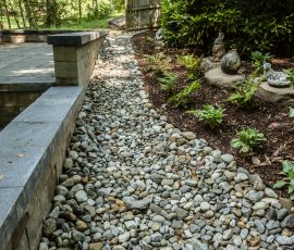 Hometown Landscape installed a Techo-Bloc Blu Grande concrete paver patio and an adjacent gravel swale to manage drainage. The patio provides a durable, low-maintenance space for relaxing or entertaining, while the gravel swale directs water away from the yard, preventing erosion and standing water. Browse the gallery to see how we created a beautiful patio paired with practical drainage solutions.