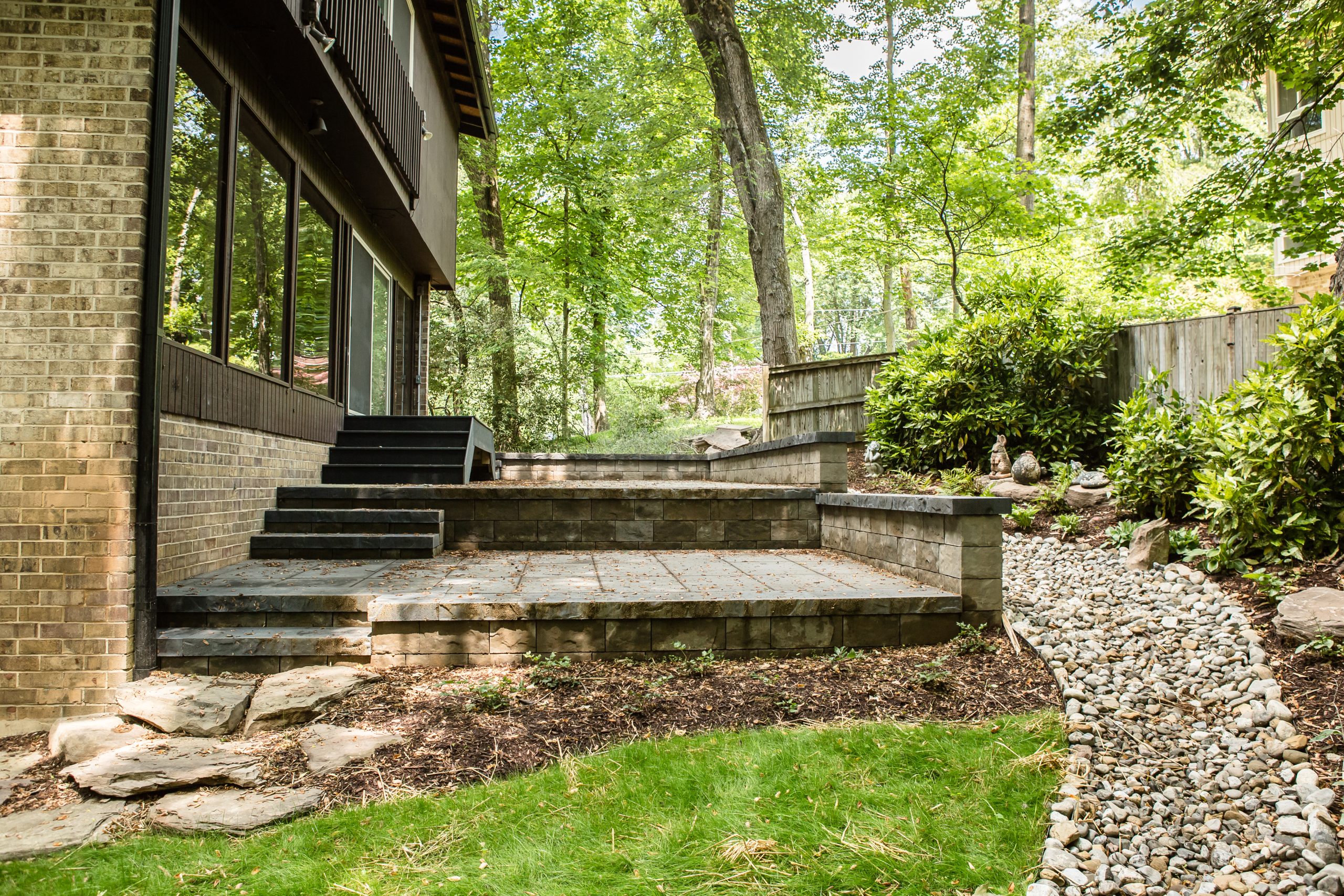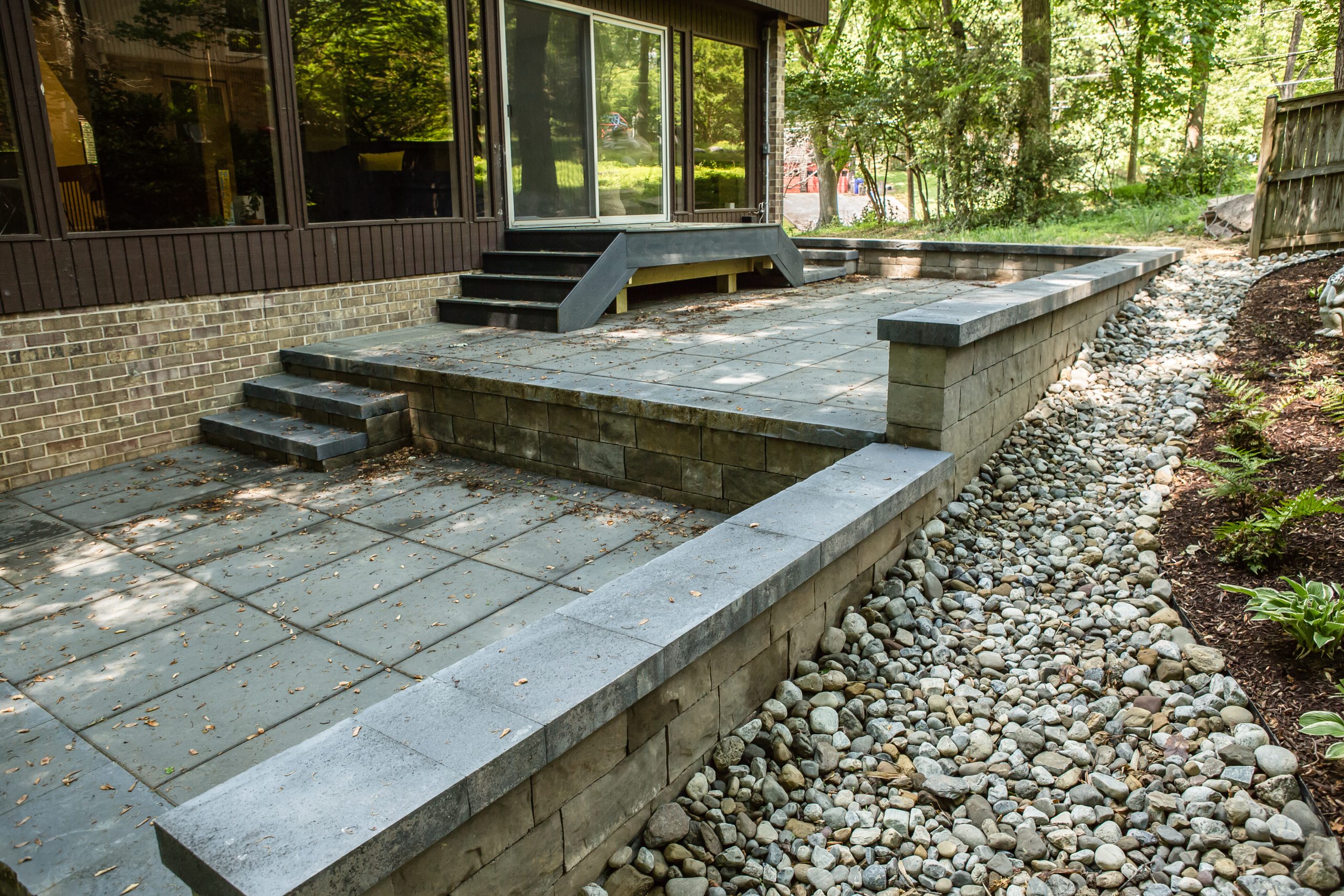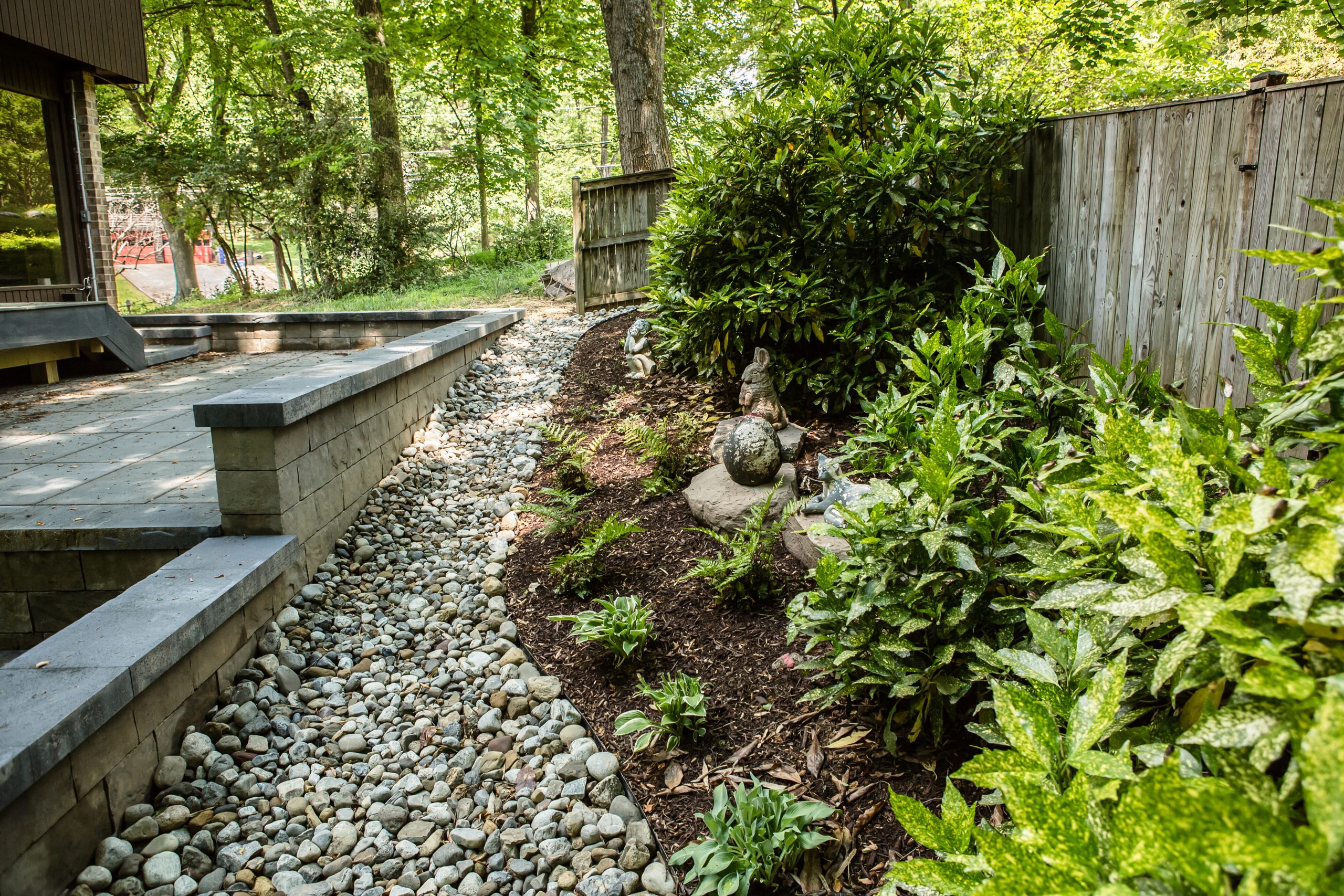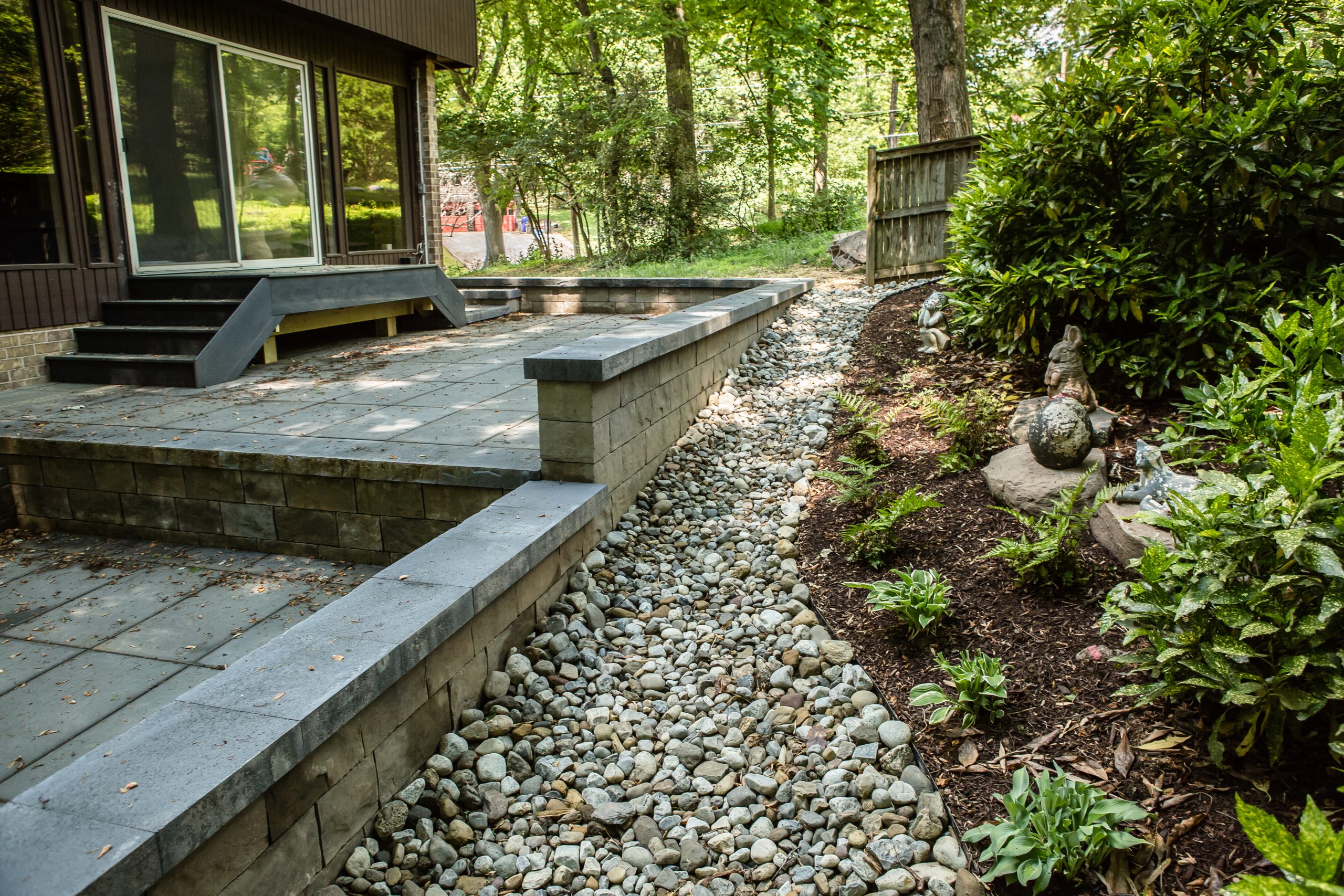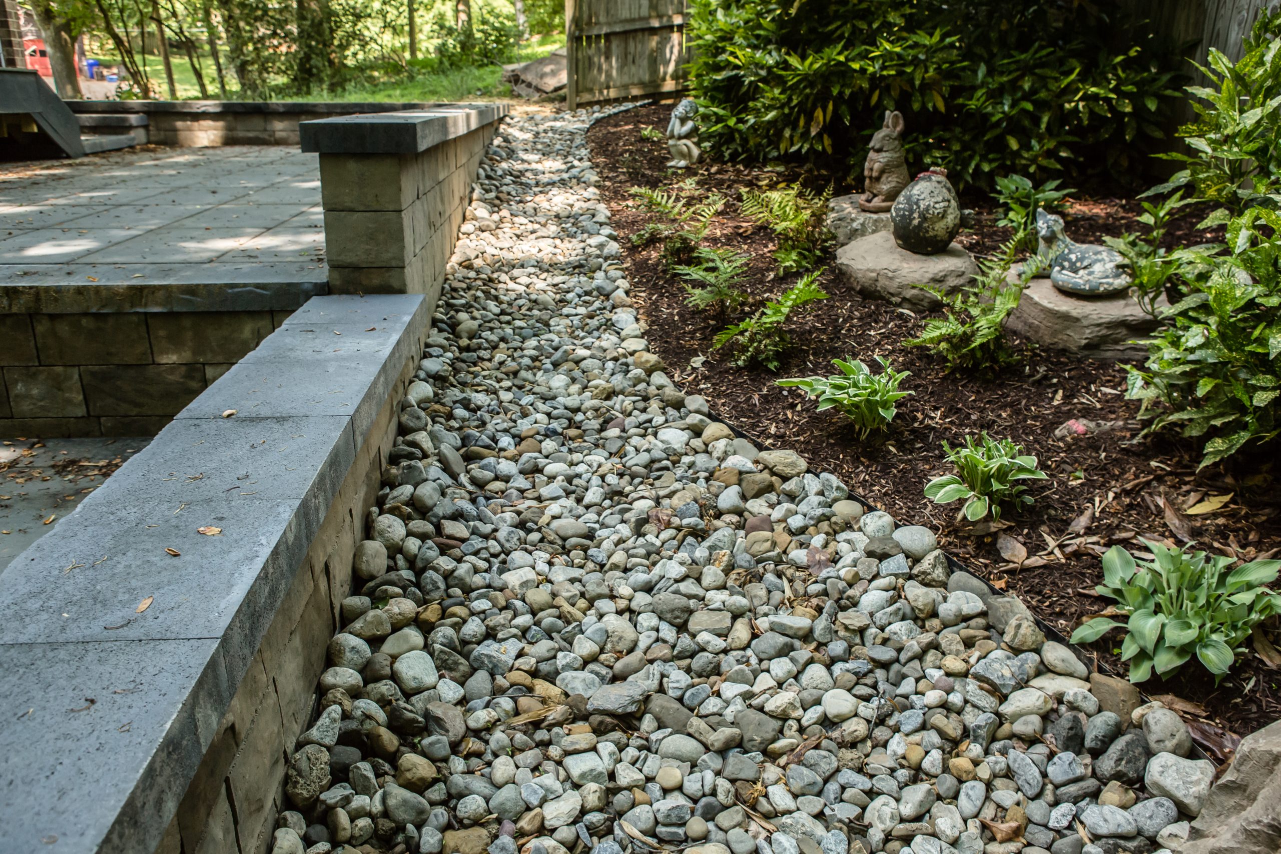 Hometown Landscape installed a Techo-Bloc Blu Grande concrete paver patio and an adjacent gravel swale to manage drainage. The patio provides a durable, low-maintenance space for relaxing or entertaining, while the gravel swale directs water away from the yard, preventing erosion and standing water. Browse the gallery to see how we created a beautiful patio paired with practical drainage solutions.