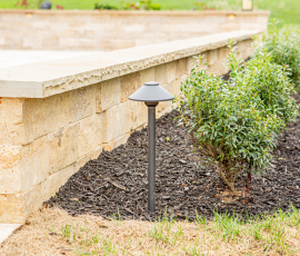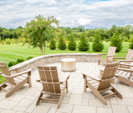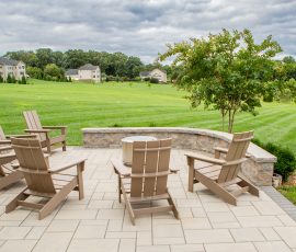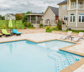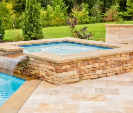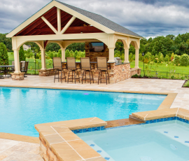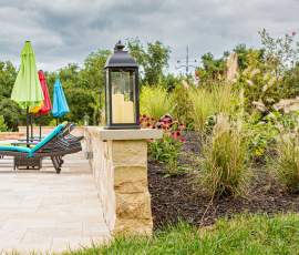 This NALP Award–winning project transformed a completely blank backyard into a luxury outdoor retreat for both relaxation and entertaining. The design showcases a pool with a sun shelf and integrated hot tub, framed by a pool deck built with Travertine French Pattern pavers. Retaining and seating walls define the space and create functional gathering areas throughout the poolscape. A stone pathway leads from the basement entrance to the pool and deck, guiding a natural flow through the yard. A pavilion anchors the space and features a fully equipped outdoor kitchen that provides shade and supports year-round use. Layered mulch beds and carefully selected plantings surround the area, softening the hardscape and enhancing the overall landscape design.