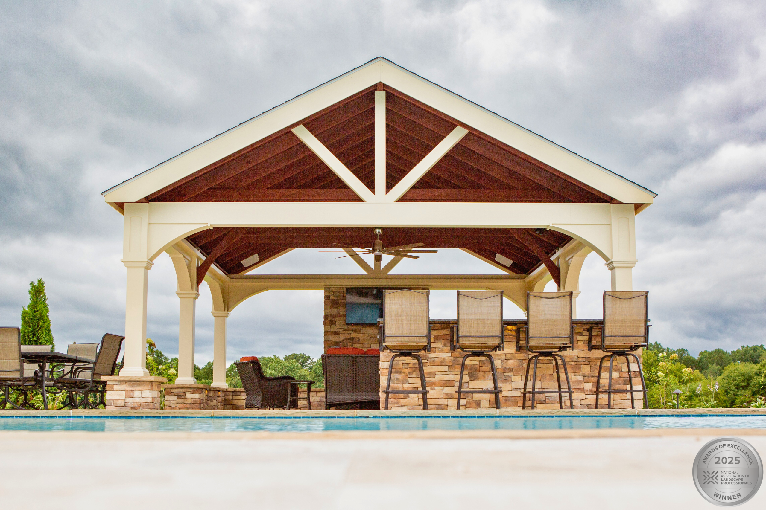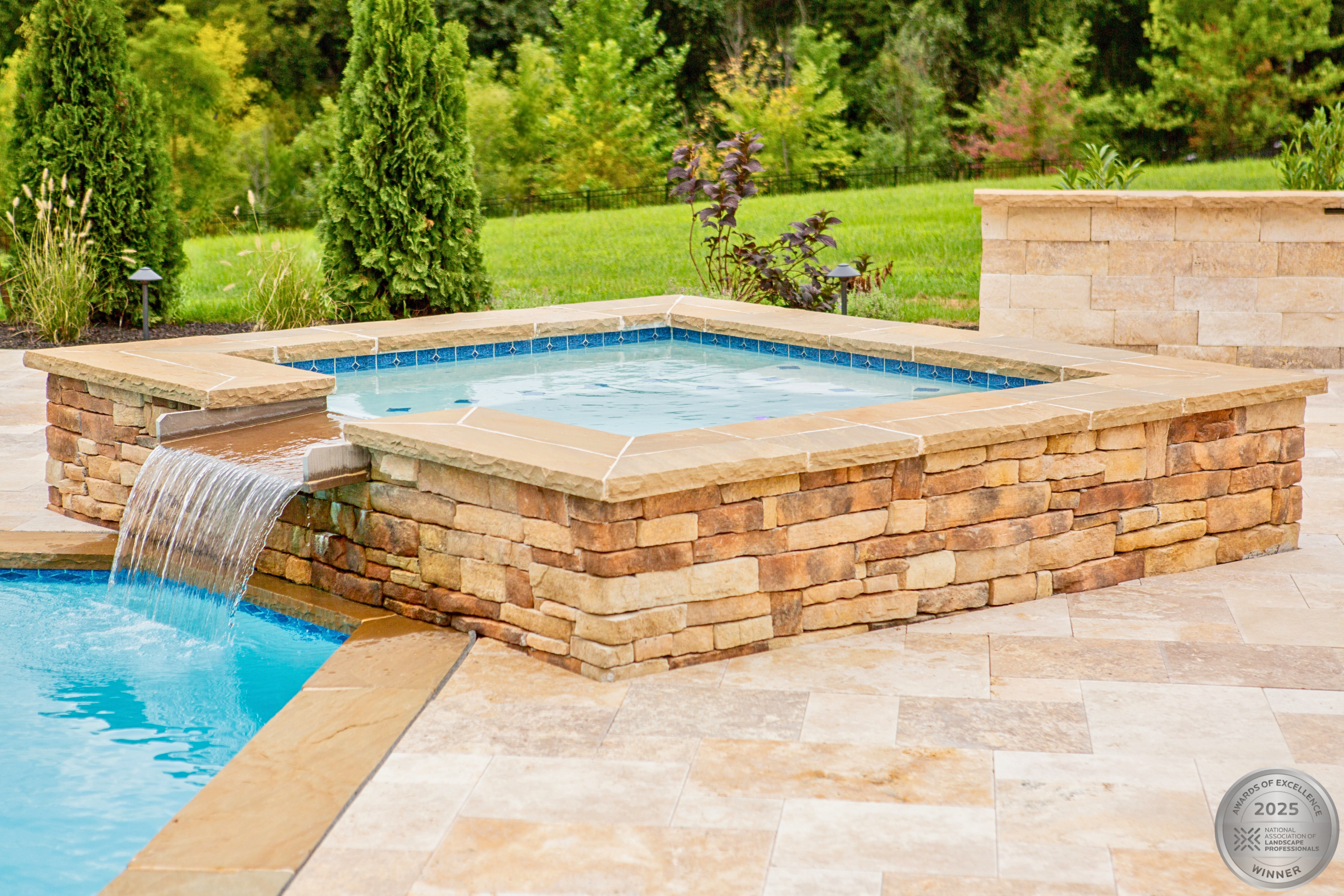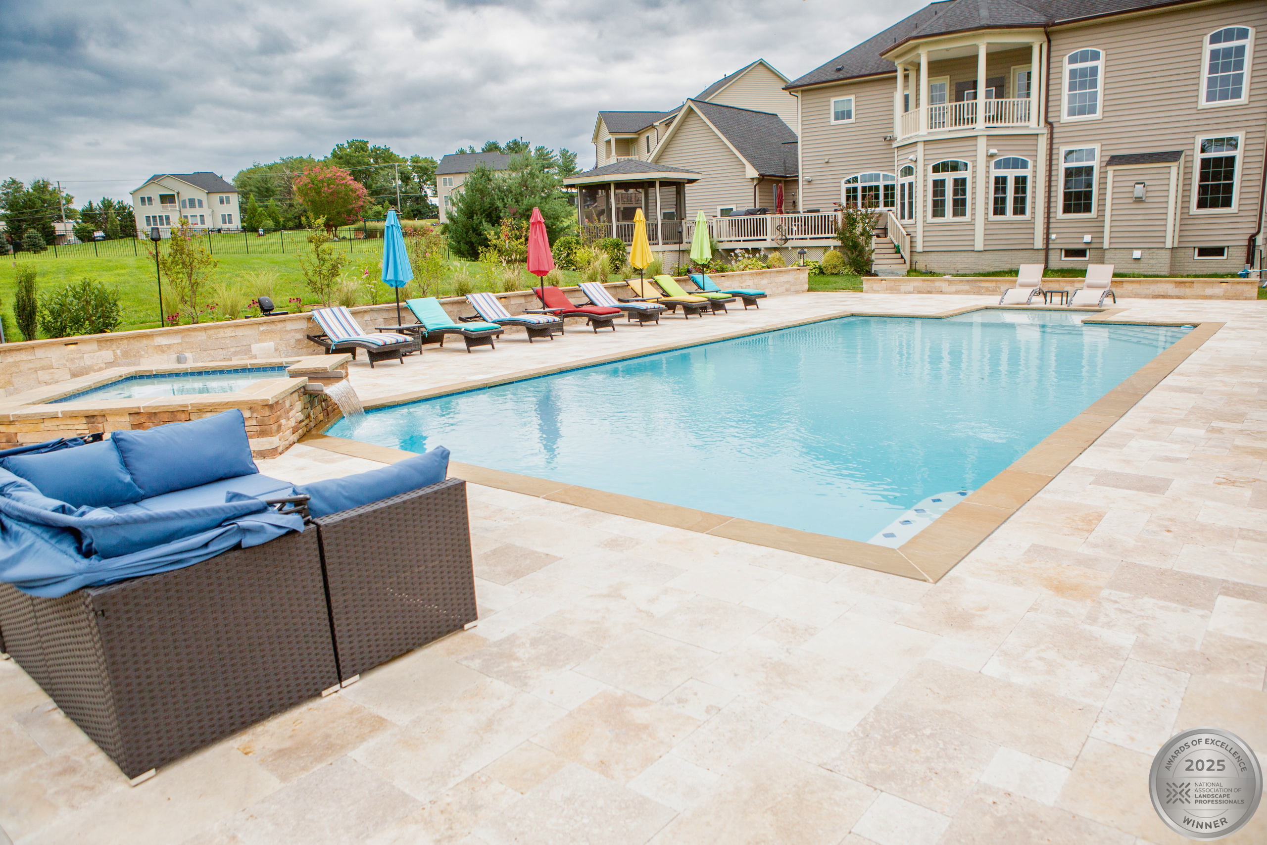 This NALP Award–winning project transformed a completely blank backyard into a luxury outdoor retreat for both relaxation and entertaining. The design showcases a pool with a sun shelf and integrated hot tub, framed by a pool deck built with Travertine French Pattern pavers. Retaining and seating walls define the space and create functional gathering areas throughout the poolscape. A stone pathway leads from the basement entrance to the pool and deck, guiding a natural flow through the yard. A pavilion anchors the space and features a fully equipped outdoor kitchen that provides shade and supports year-round use. Layered mulch beds and carefully selected plantings surround the area, softening the hardscape and enhancing the overall landscape design.