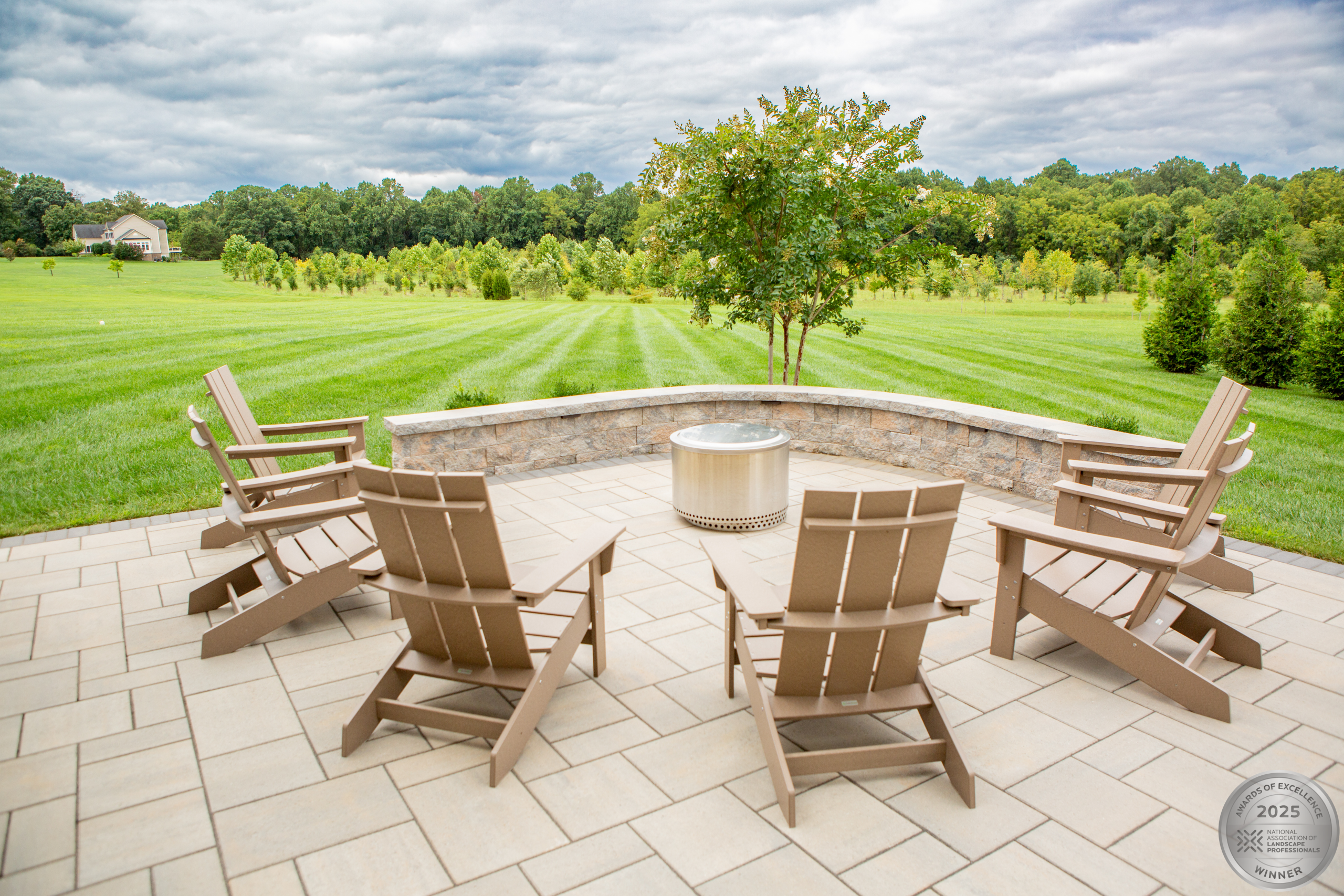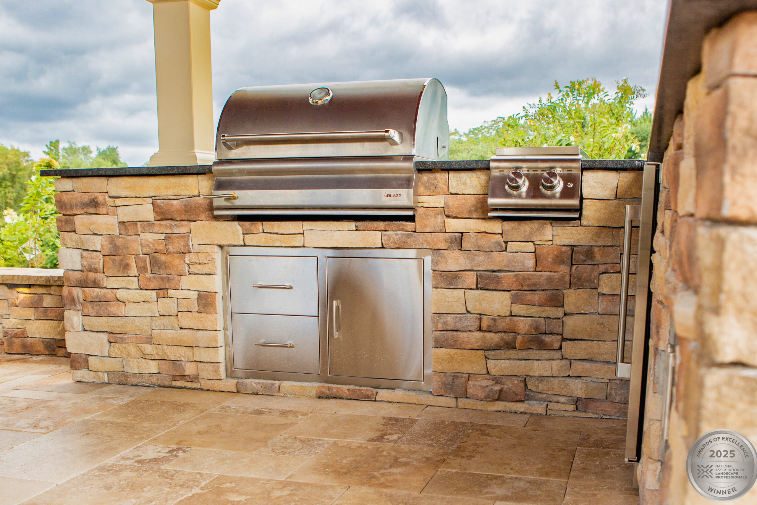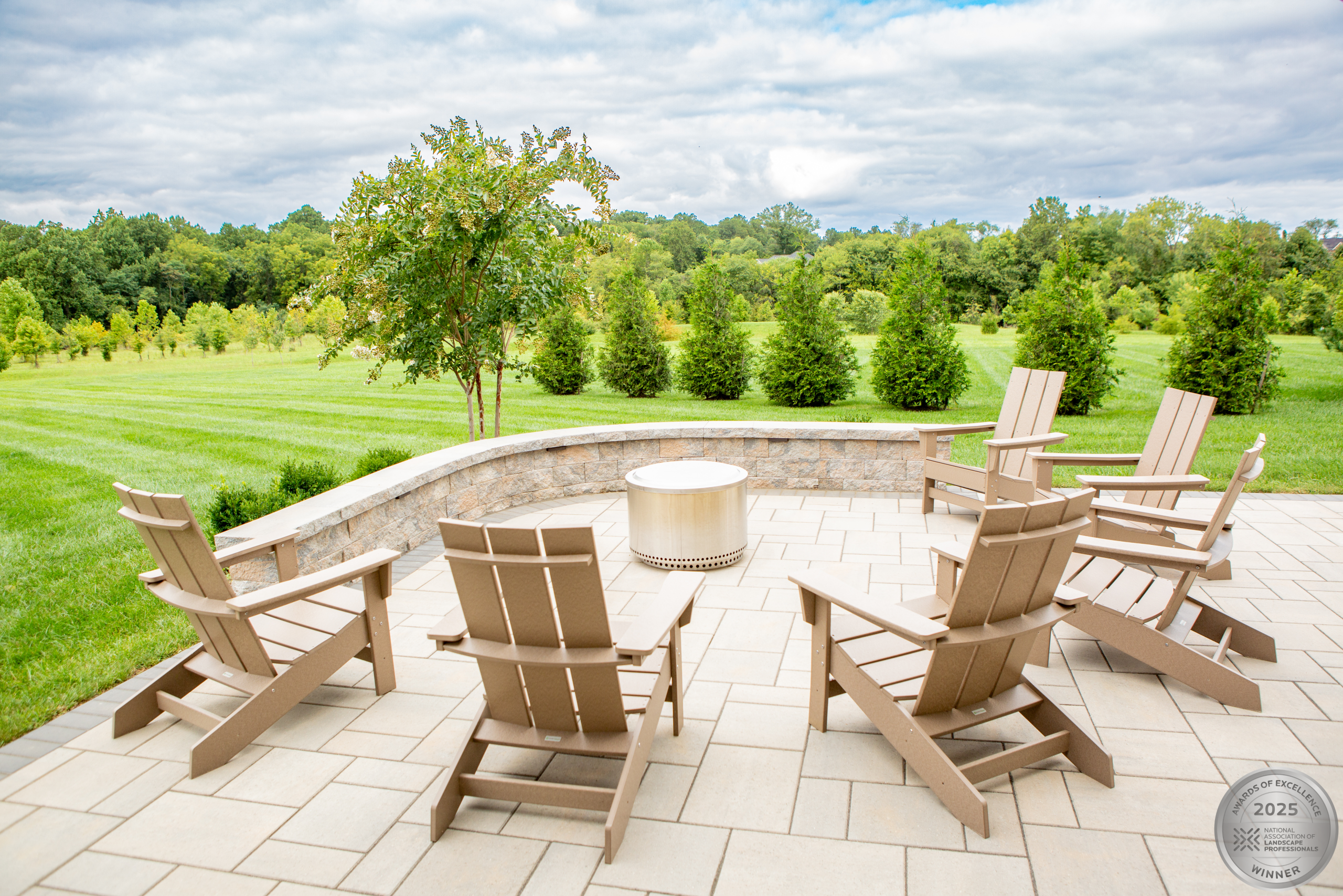 This NALP Award–winning project transformed a completely blank backyard into a luxury outdoor retreat for both relaxation and entertaining. The design showcases a pool with a sun shelf and integrated hot tub, framed by a pool deck built with Travertine French Pattern pavers. Retaining and seating walls define the space and create functional gathering areas throughout the poolscape. A stone pathway leads from the basement entrance to the pool and deck, guiding a natural flow through the yard. A pavilion anchors the space and features a fully equipped outdoor kitchen that provides shade and supports year-round use. Layered mulch beds and carefully selected plantings surround the area, softening the hardscape and enhancing the overall landscape design.